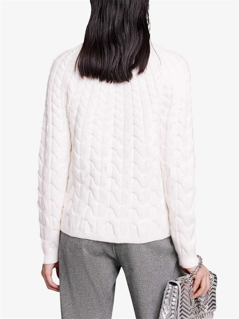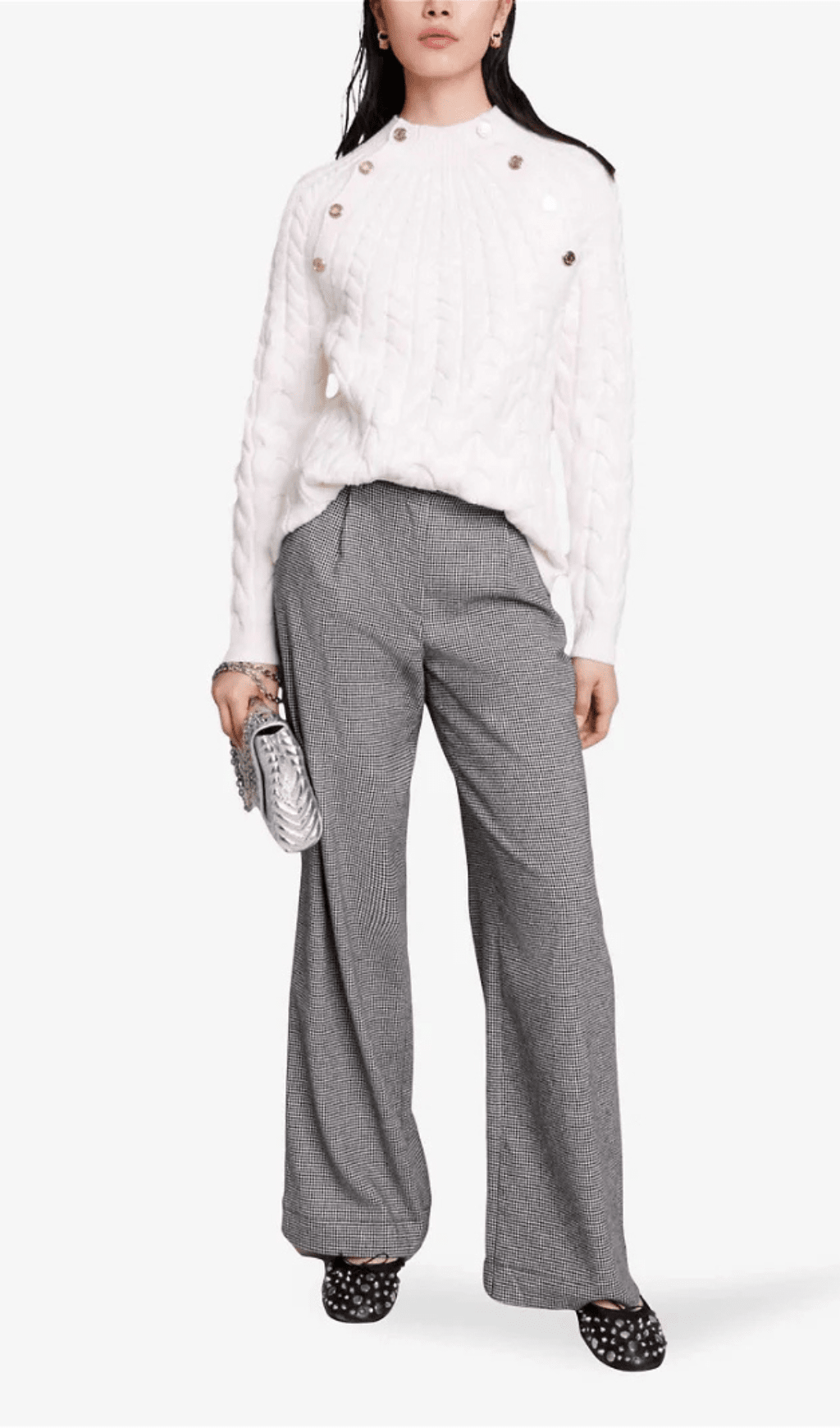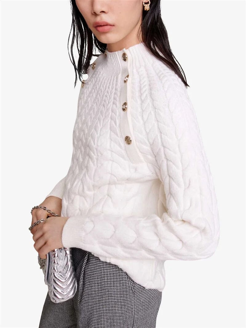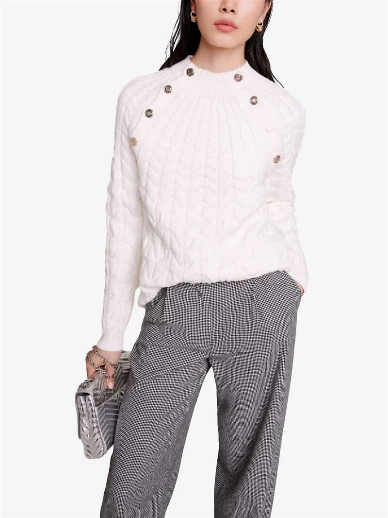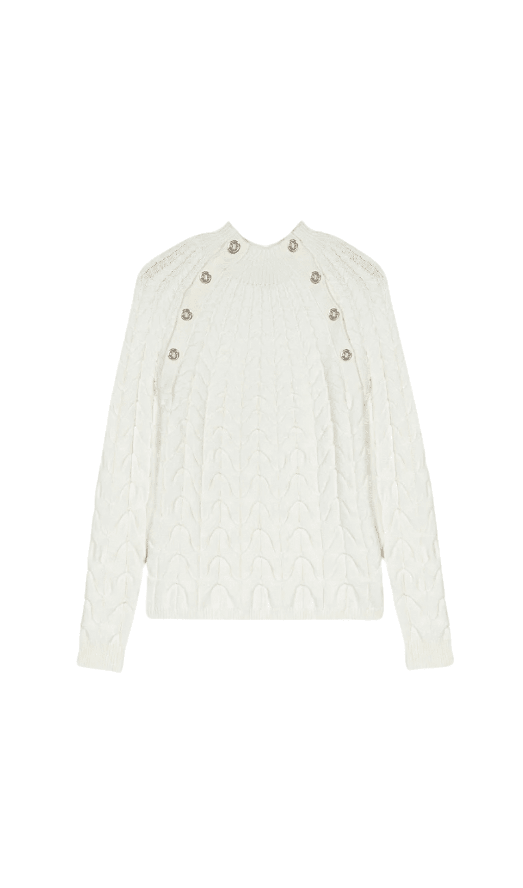 This sweater features a trendy cable knit design and unique button trim details that add a touch of playfulness. Perfect for staying warm and looking cool. (Time to hit that sweater weather button!)