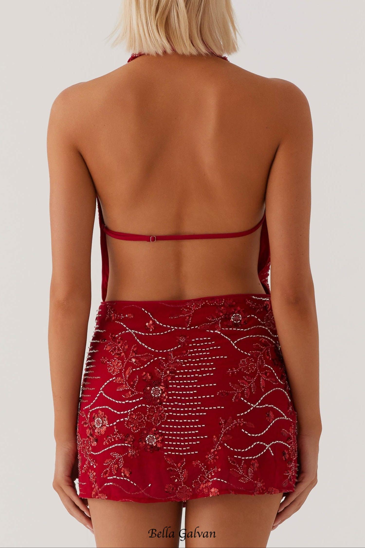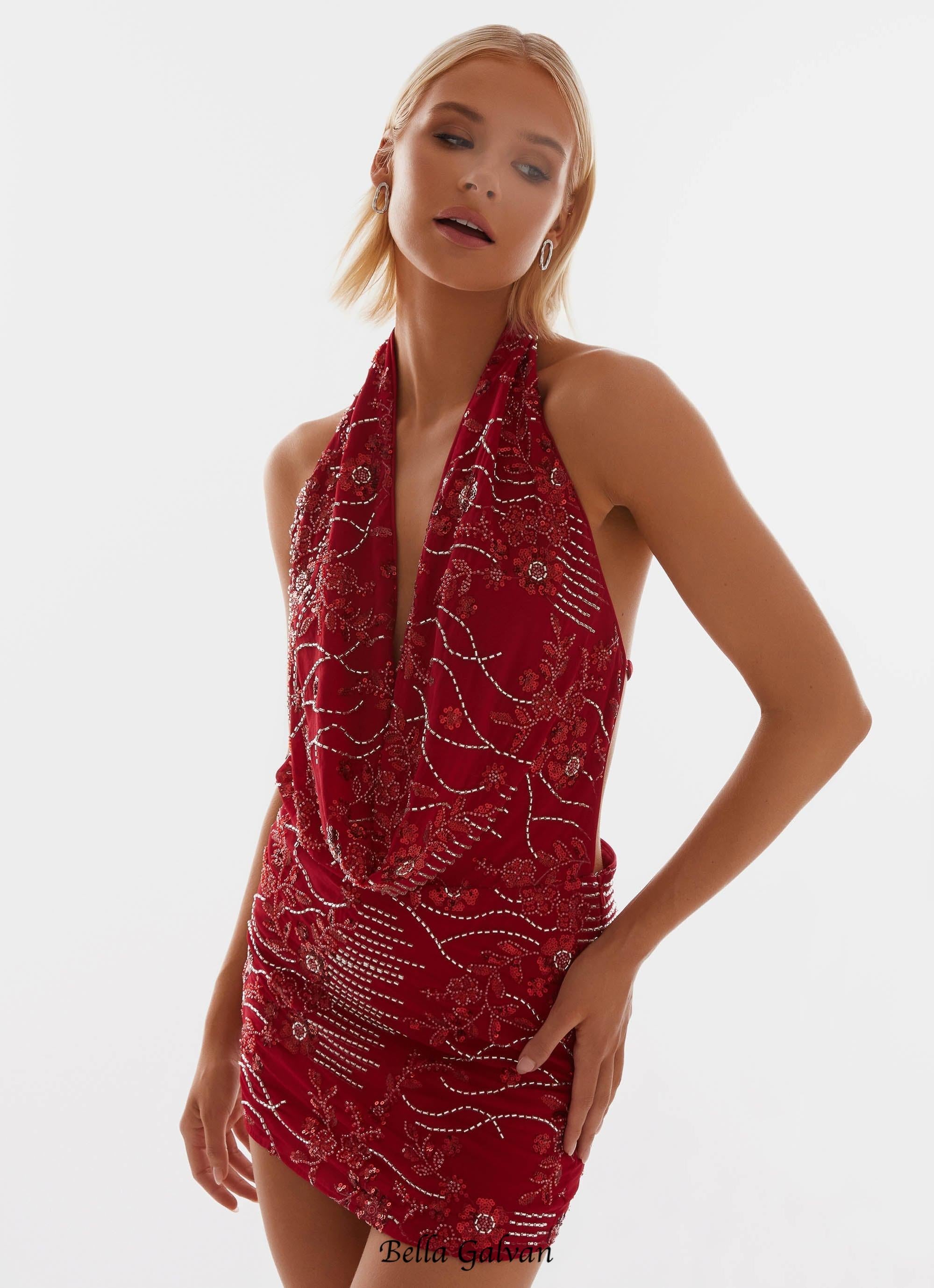 Elevate your evening wardrobe with this red cowl neck mini dress, exquisitely adorned with delicate beadwork. The draped neckline enhances elegance while the mini length offers a modern, flattering silhouette. Perfect for special occasions, this dress combines sophisticated detailing with a bold color to ensure you stand out with refined style.