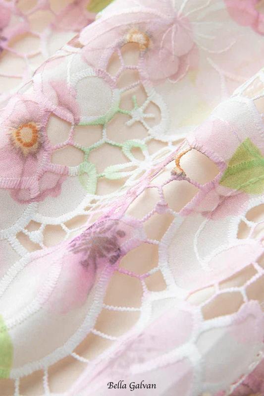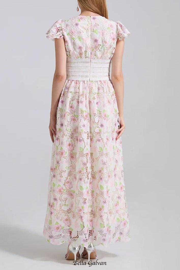 This elegant dress features flying sleeves and a high waist design that enhances a slim fit silhouette. Crafted from delicate floral lace, it offers a refined texture and sophisticated appeal. Ideal for formal occasions, the dress combines classic femininity with modern tailoring to flatter your figure gracefully.