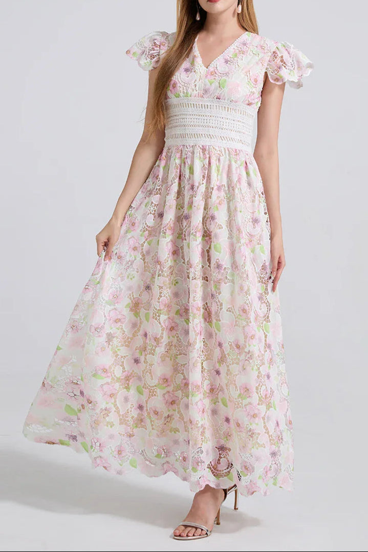 FLYING SLEEVES HIGH WAIST SLIM FIT FLORAL LACE DRESS