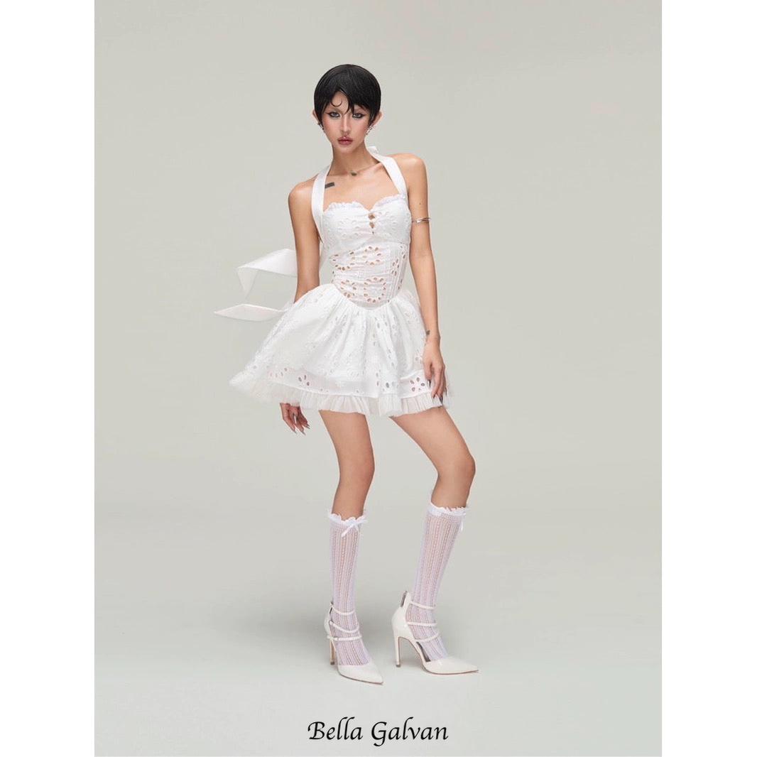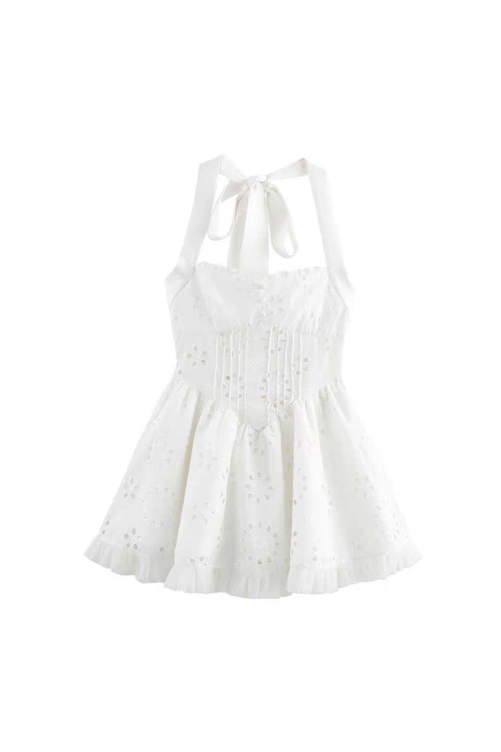 Elegantly crafted halter mini dress featuring intricate embroidery and hollow detailing. The pristine white fabric creates a sophisticated silhouette while the halter neckline offers a flattering fit. Perfect for summer events, beach outings, or evening gatherings where a refined yet relaxed aesthetic is desired. Pairs beautifully with statement accessories for a complete look.