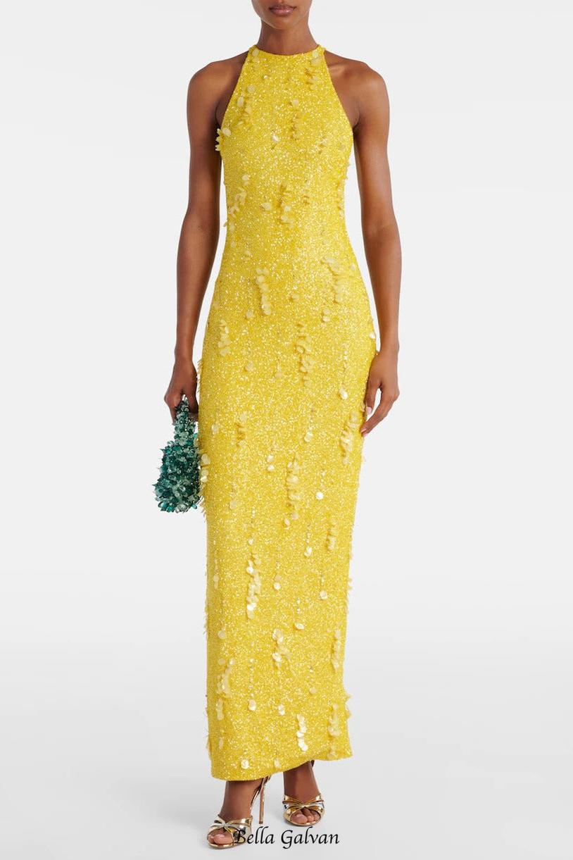 Elevate your evening wardrobe with this striking Kelly beaded sequined sleeveless maxi dress in vibrant yellow. The intricate beadwork and shimmering sequins create a luminous, eye-catching finish that commands attention at any formal occasion. The sleeveless silhouette offers a sophisticated, modern aesthetic, while the flowing maxi length provides elegant movement and graceful draping. Perfect for galas, weddings, or upscale celebrations, this dress combines refined craftsmanship with contemporary design. The bold yellow hue radiates confidence and joy, making it an unforgettable statement piece for the discerning dresser.