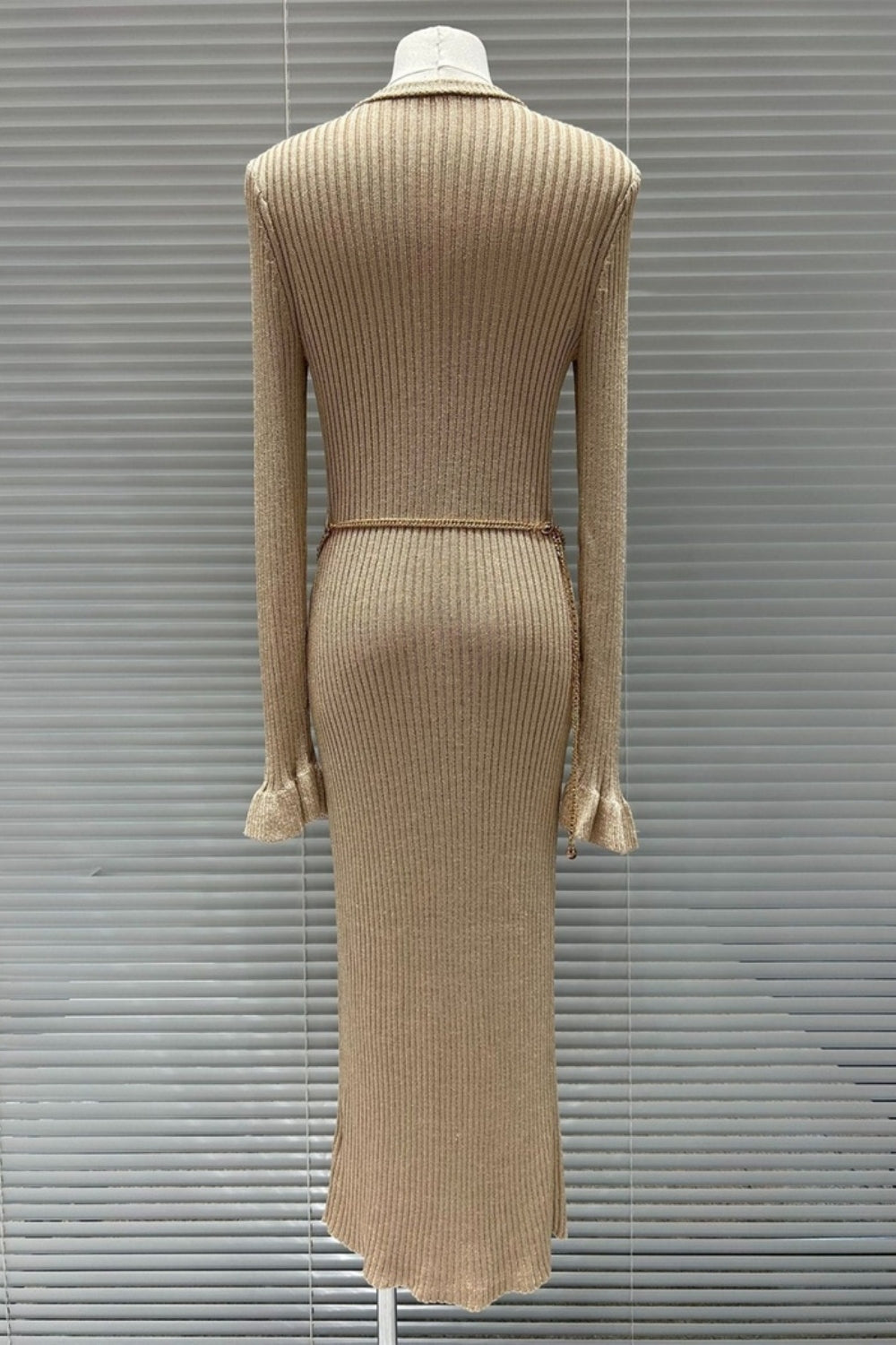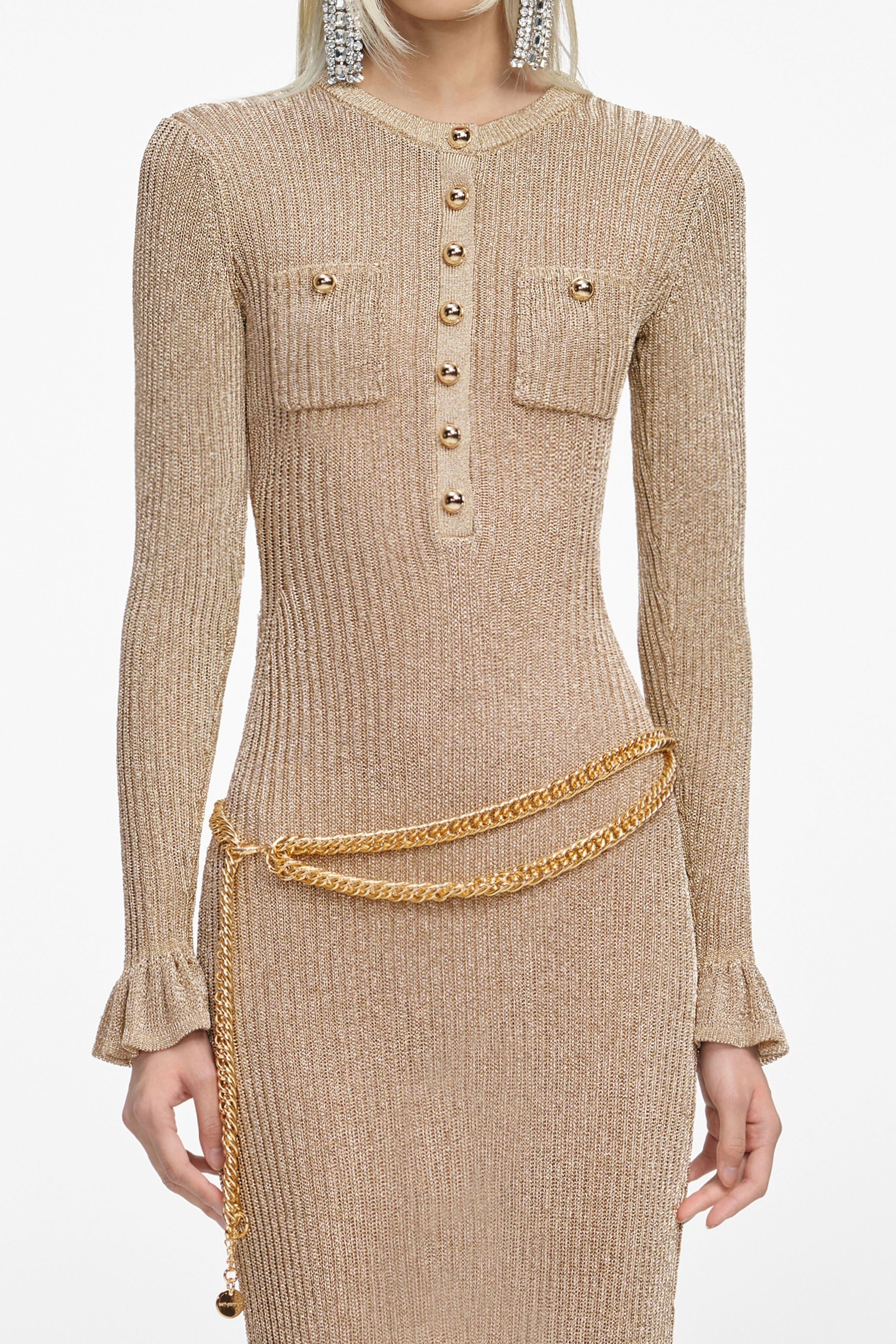 Crafted from lurex knit, this gold midi dress comes with built-in shimmer. Gold buttons and a detachable chain belt double down on the more-is-more aesthetic – ready for a glamorous night out.