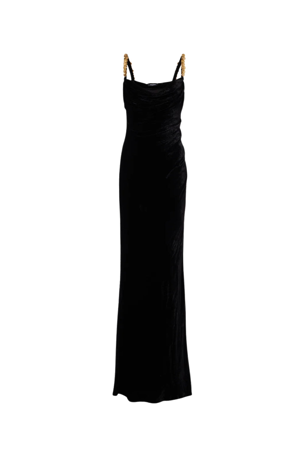 Elevate your evening wardrobe with this sophisticated velvet maxi dress, featuring a striking square neckline and luxurious draping. The standout metal chain straps add an edgy, contemporary edge while maintaining refined elegance. Crafted from sumptuous velvet in classic black, this floor-length silhouette flatters the figure and transitions seamlessly from formal events to upscale occasions. The combination of soft fabric and bold hardware creates a compelling contrast that commands attention. Perfect for those who appreciate understated luxury with a modern twist.