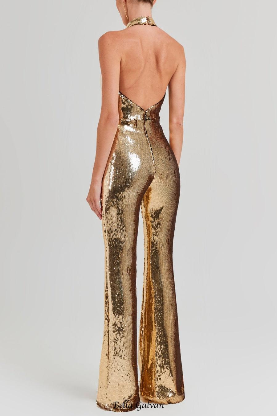 nora gold Sequin halterneck deep V high waist flared jumpsuit