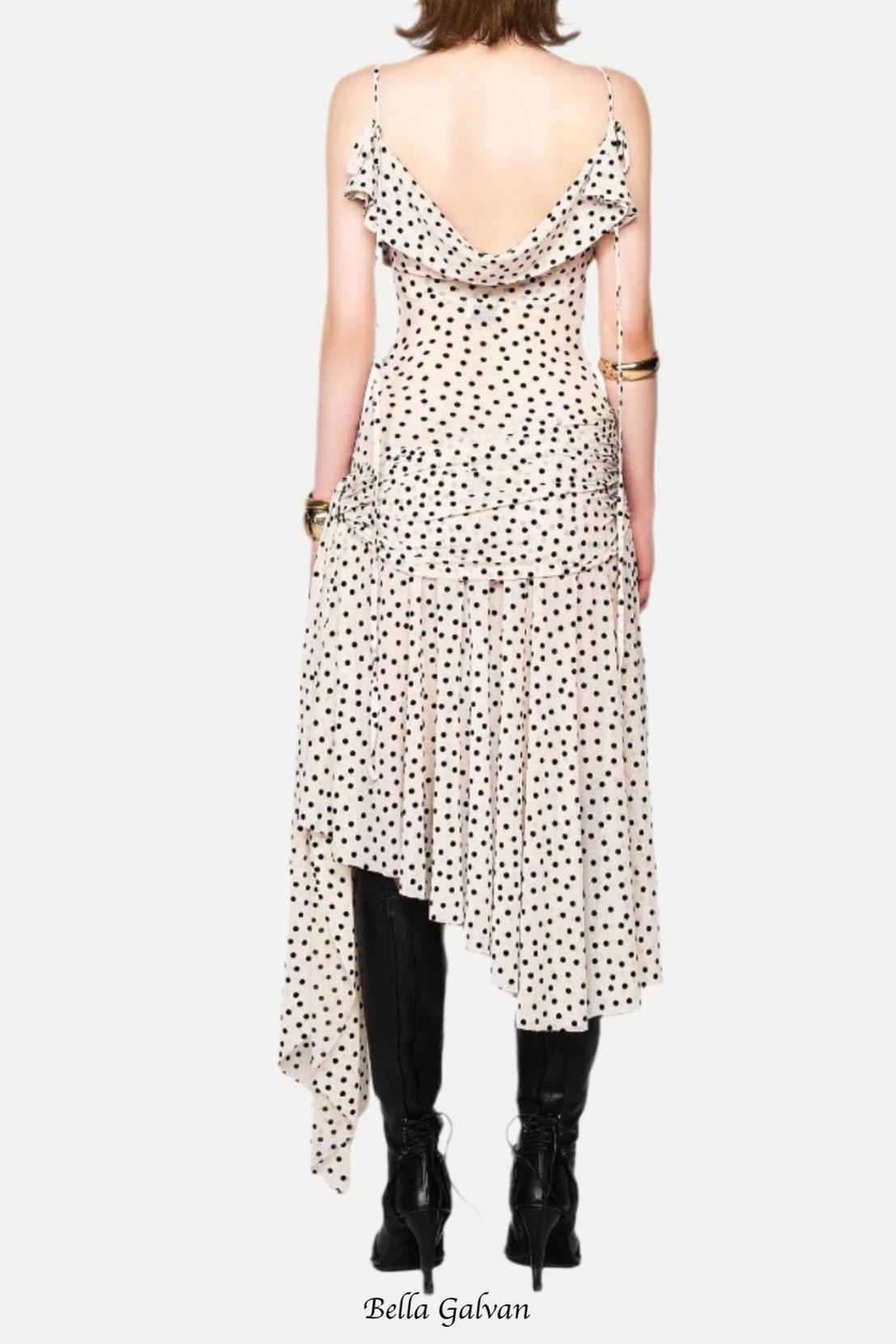 Be the ultimate fashionista with our polka dot sleeveless midi dress in apricot. This elegant and stylish dress features an irregular hemline, giving it a unique touch. The polka dot pattern adds a playful yet sophisticated element, making it perfect for any occasion. Embrace your individuality and stand out in this must-have dress.