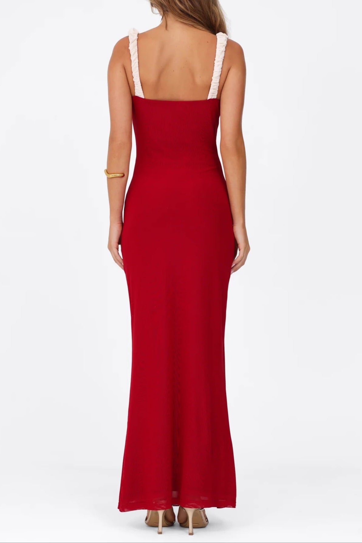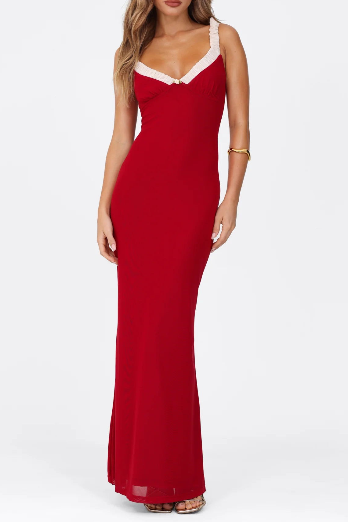 red Bustier maxi dress with a v-neckline