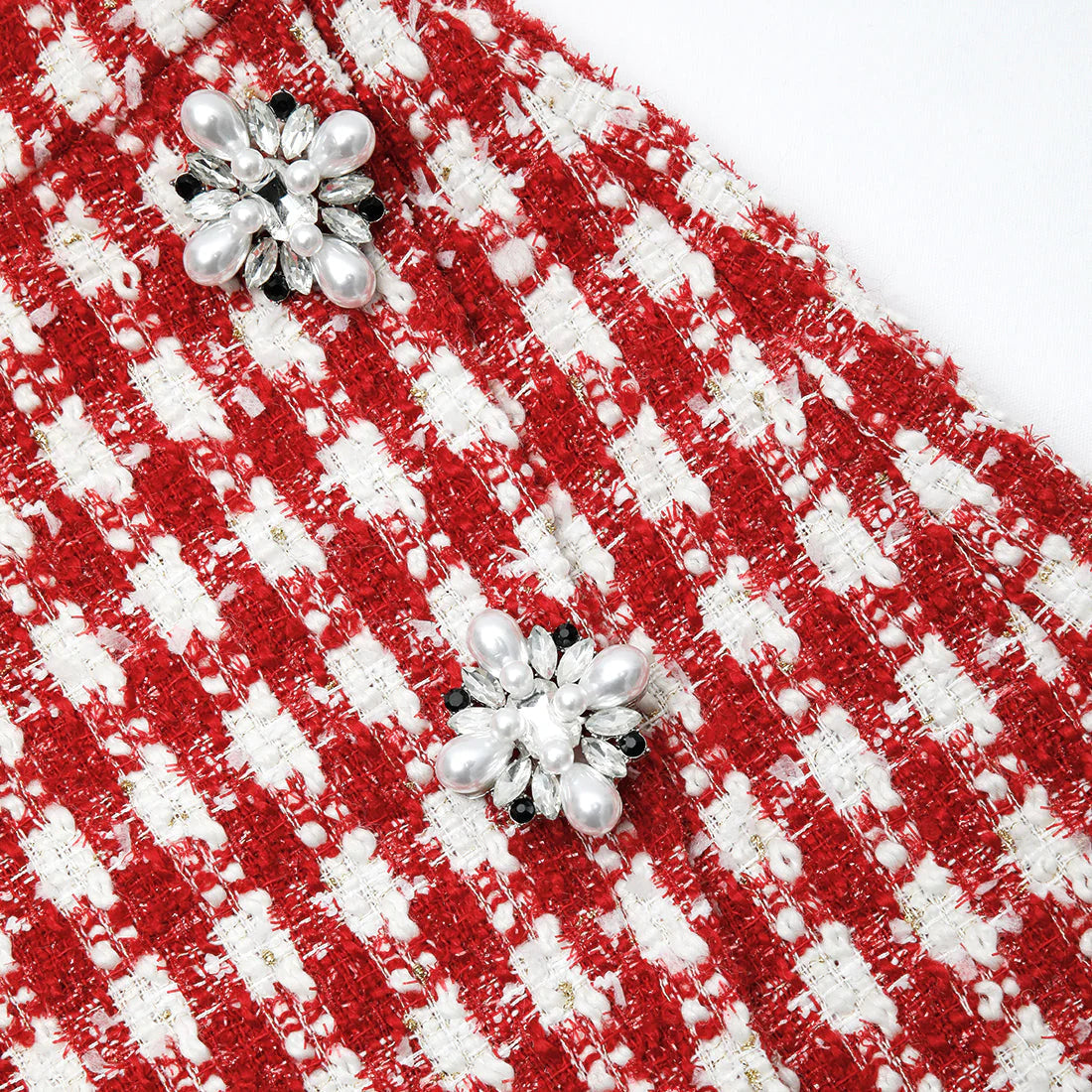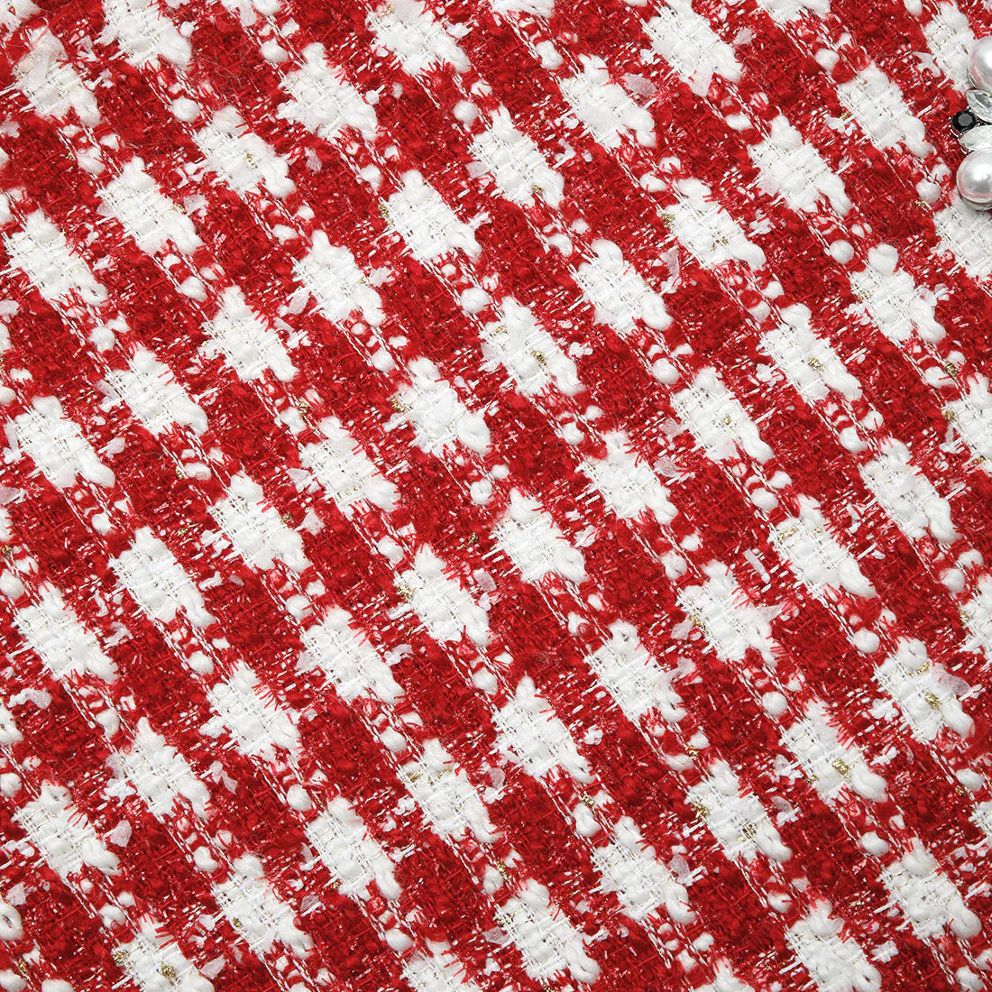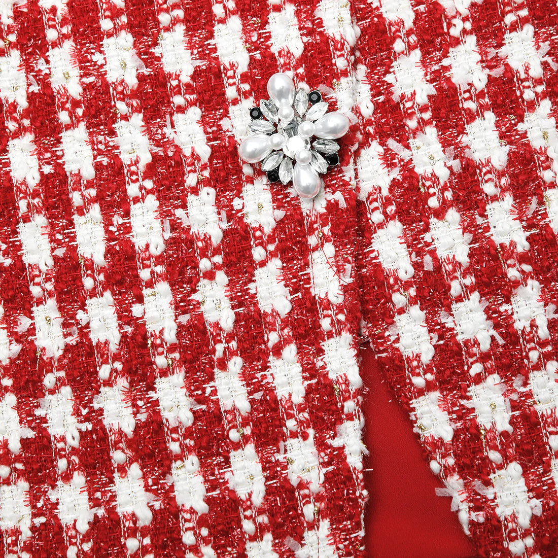 Made with soft boucle fabric, this dress features a bold red check pattern for a playful and unique look. Perfect for any occasion, it's sure to add a pop of color to your wardrobe.