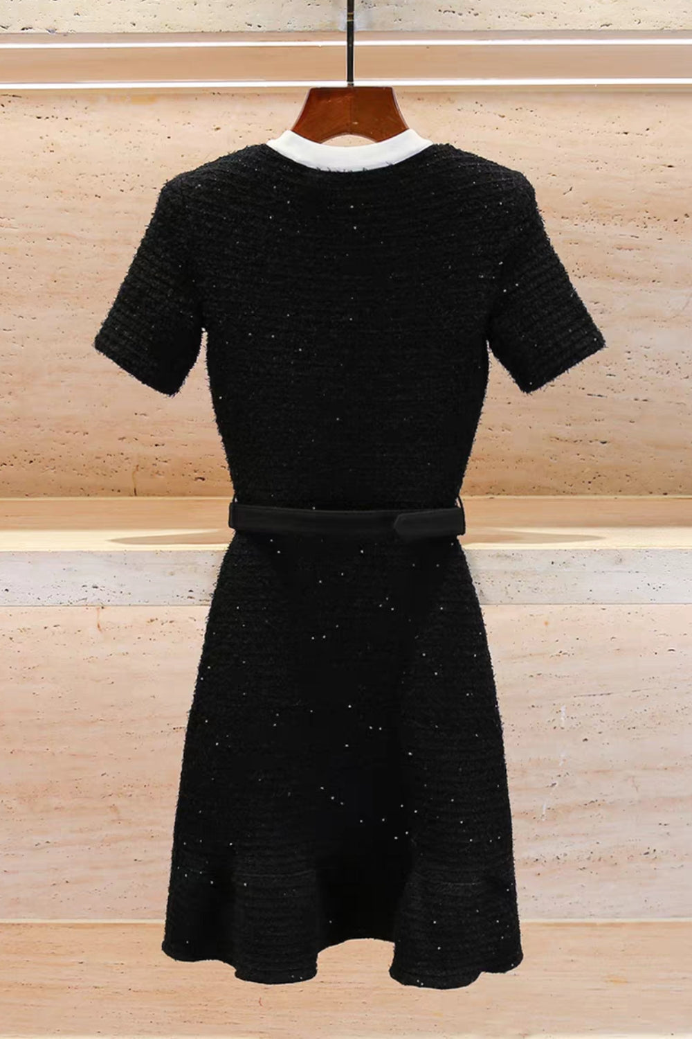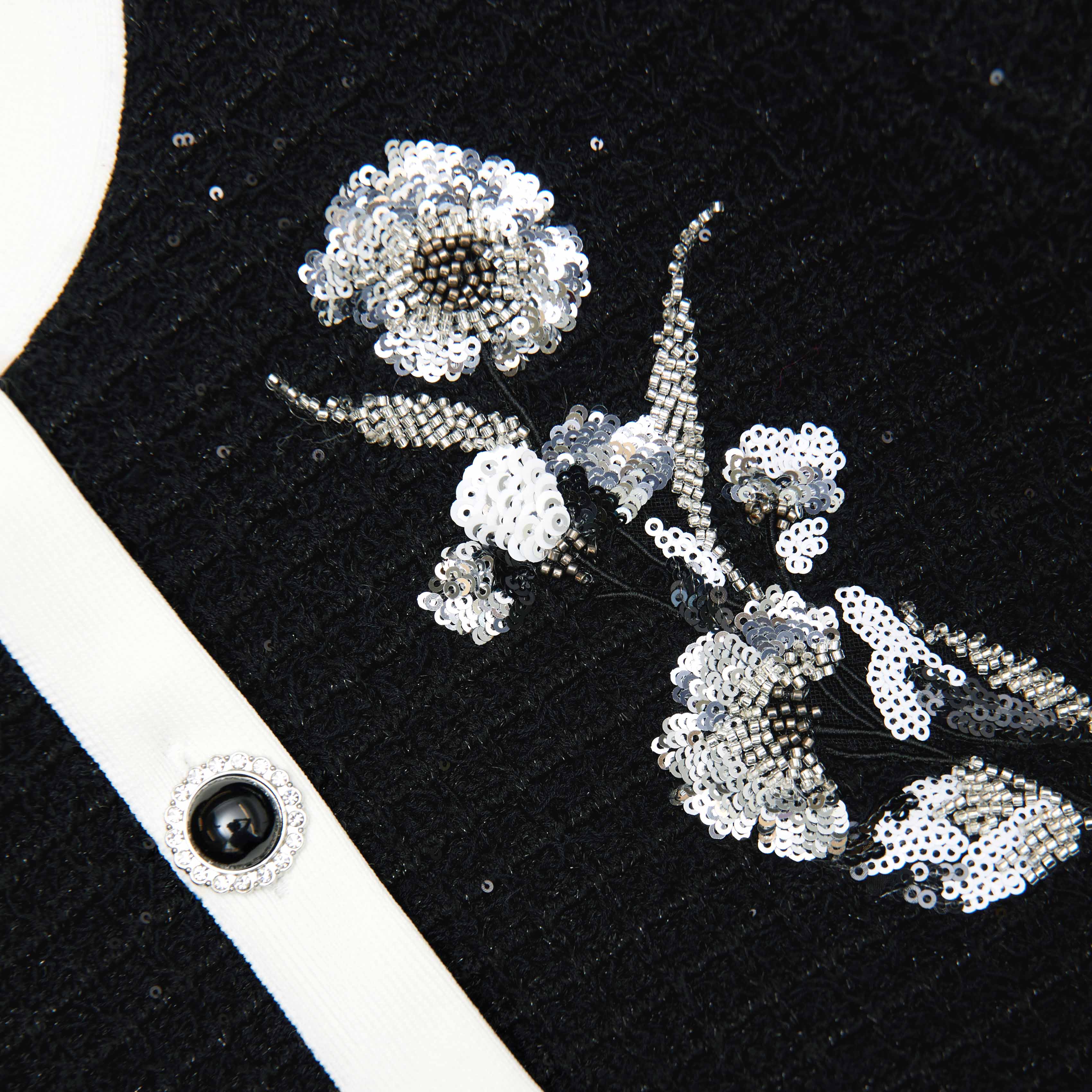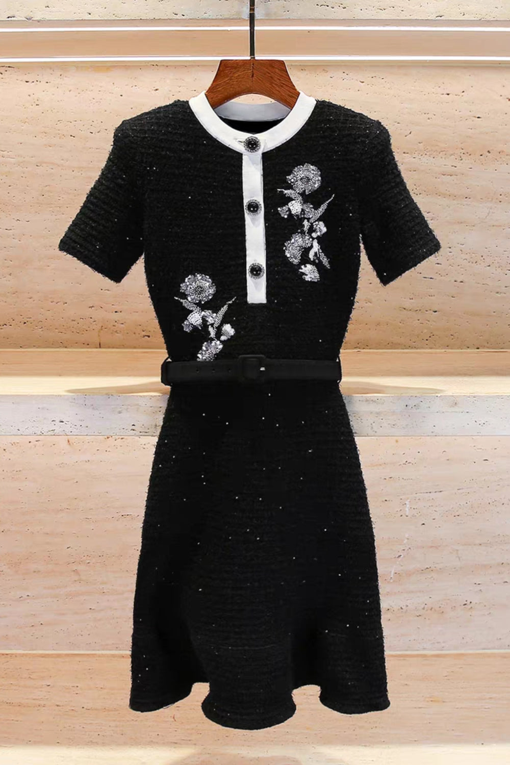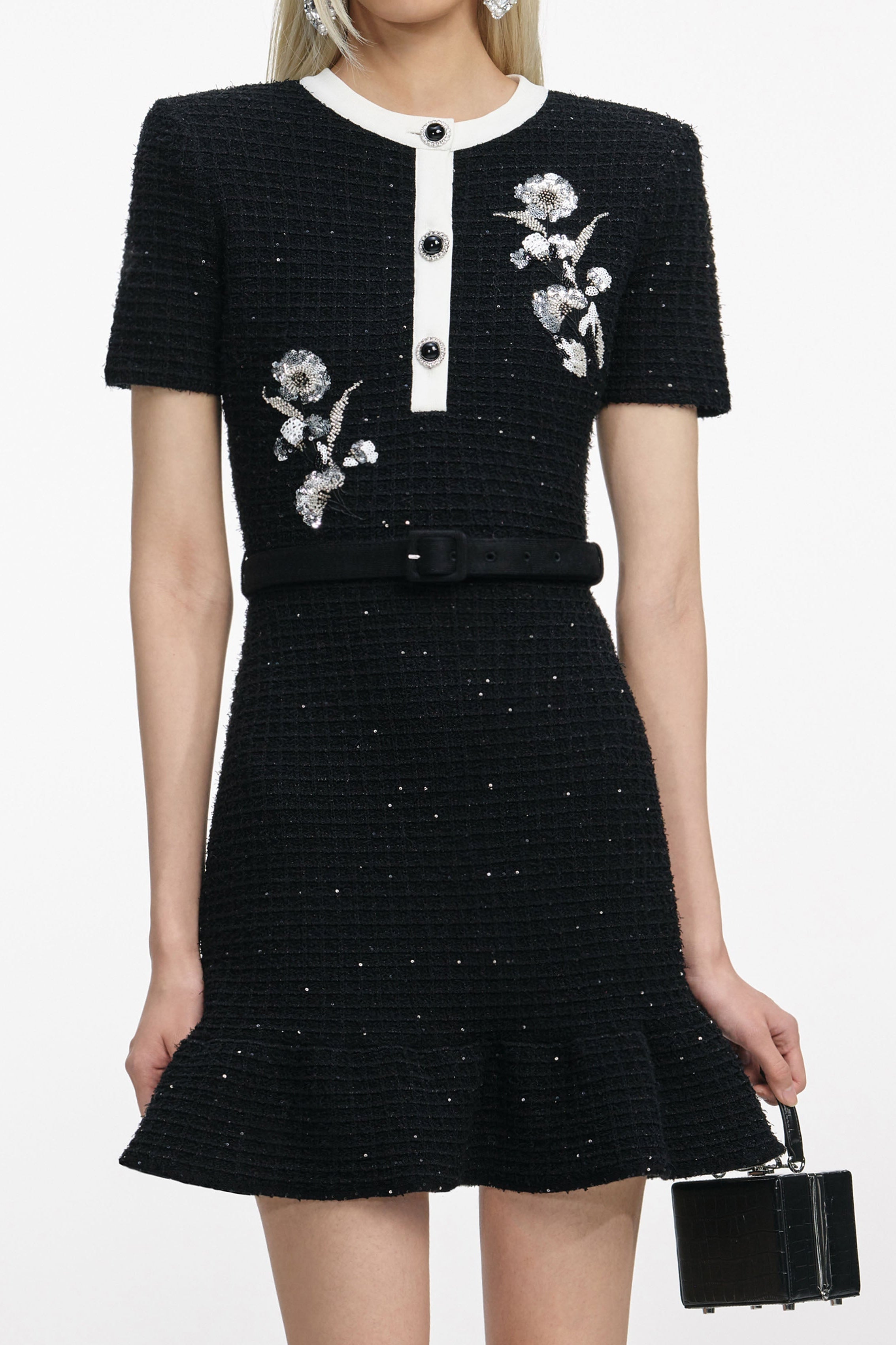 Cut from black textured knit for a soft yet sculpted fit, contrast trims and sequin flower motifs make this dress a no-brainer for all events. Pair its flirty flared hem with flats and heels alike.