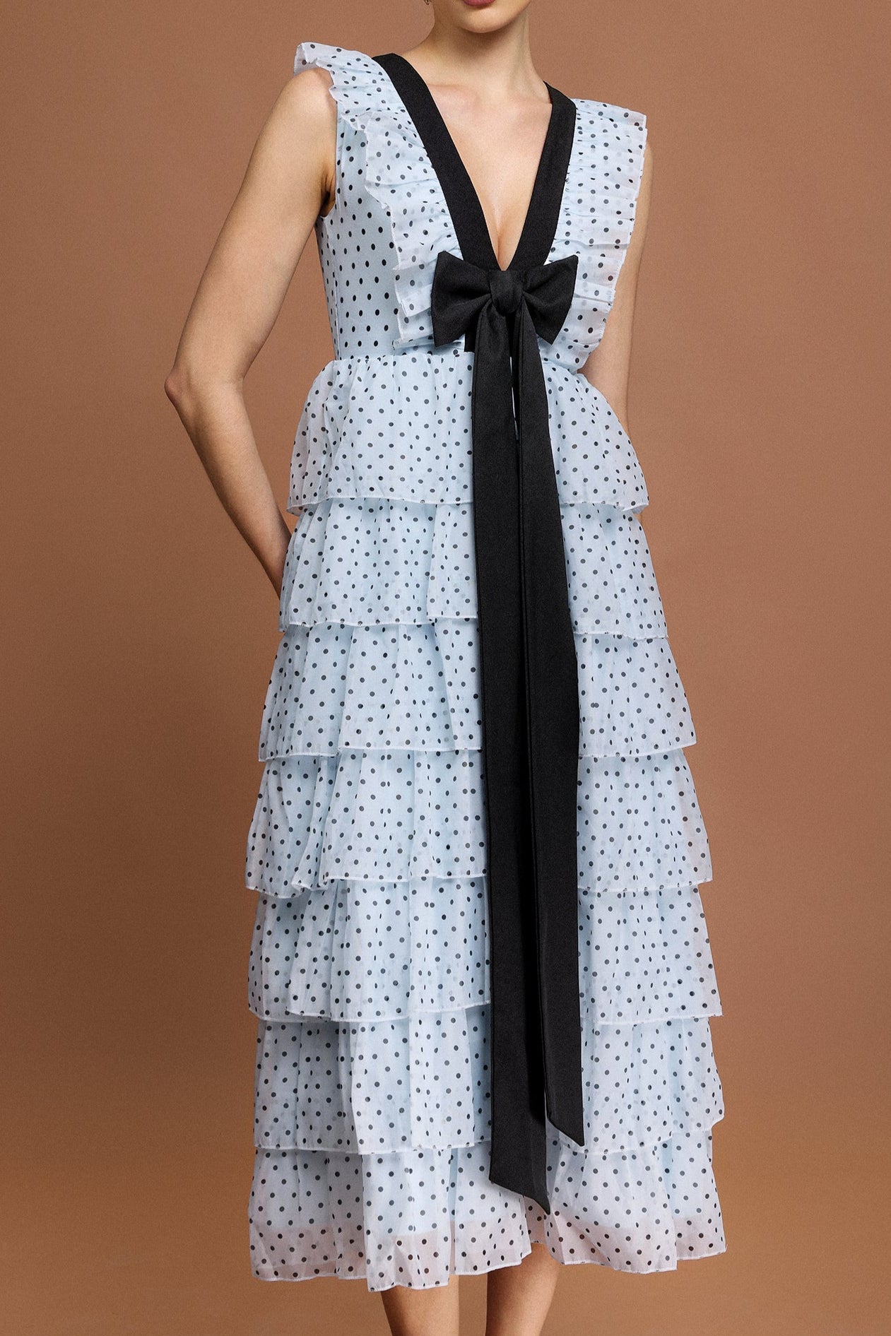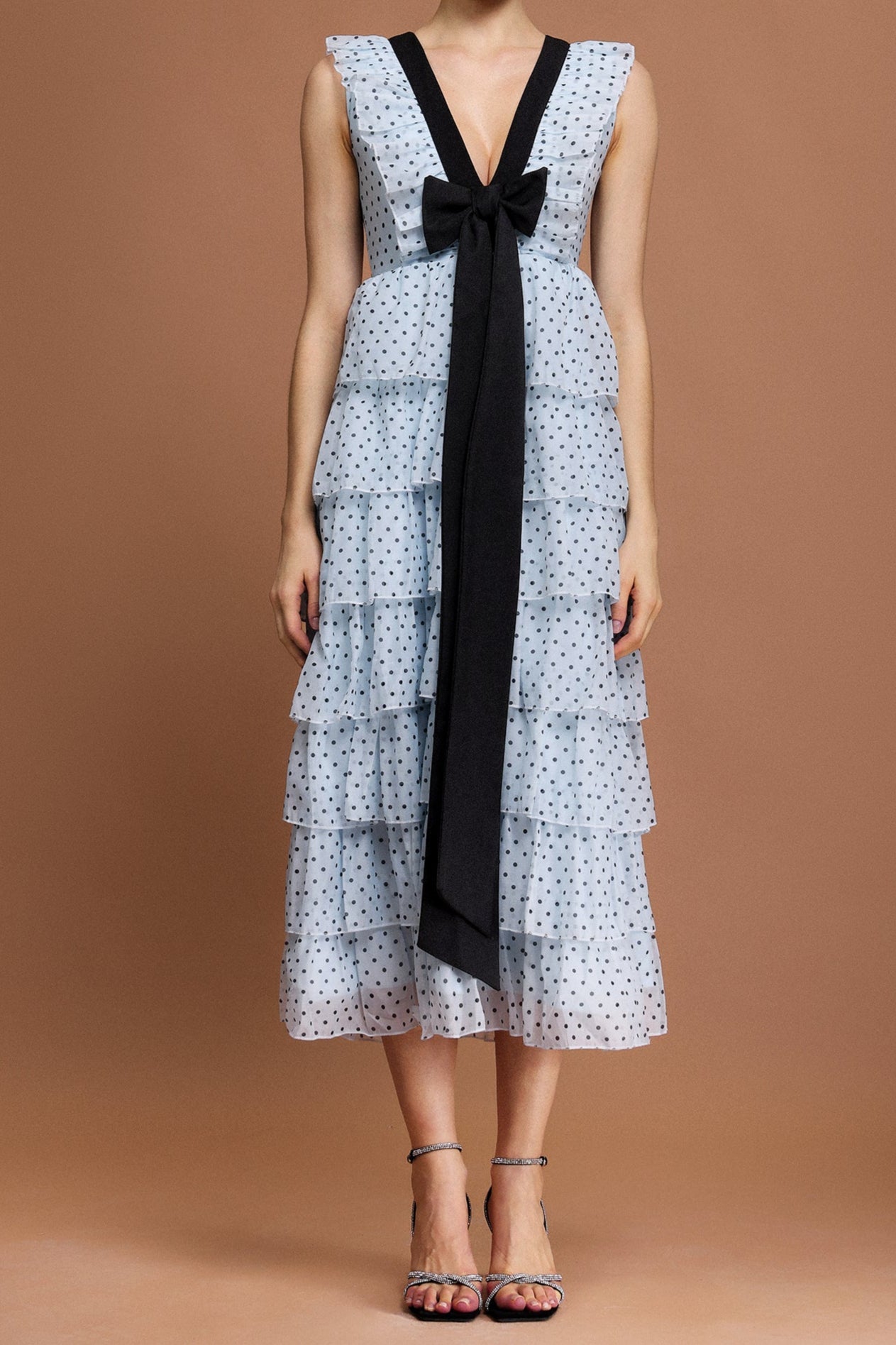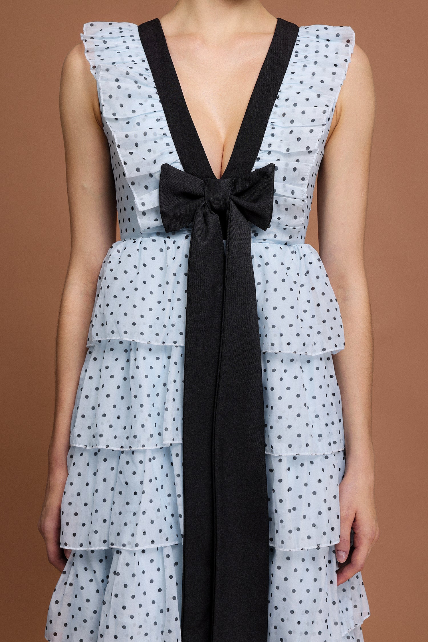 V-Neck Sleeveless Bowknot Folds Dot Printed Midi Dress - S is backordered and will ship as soon as it is back in stock.