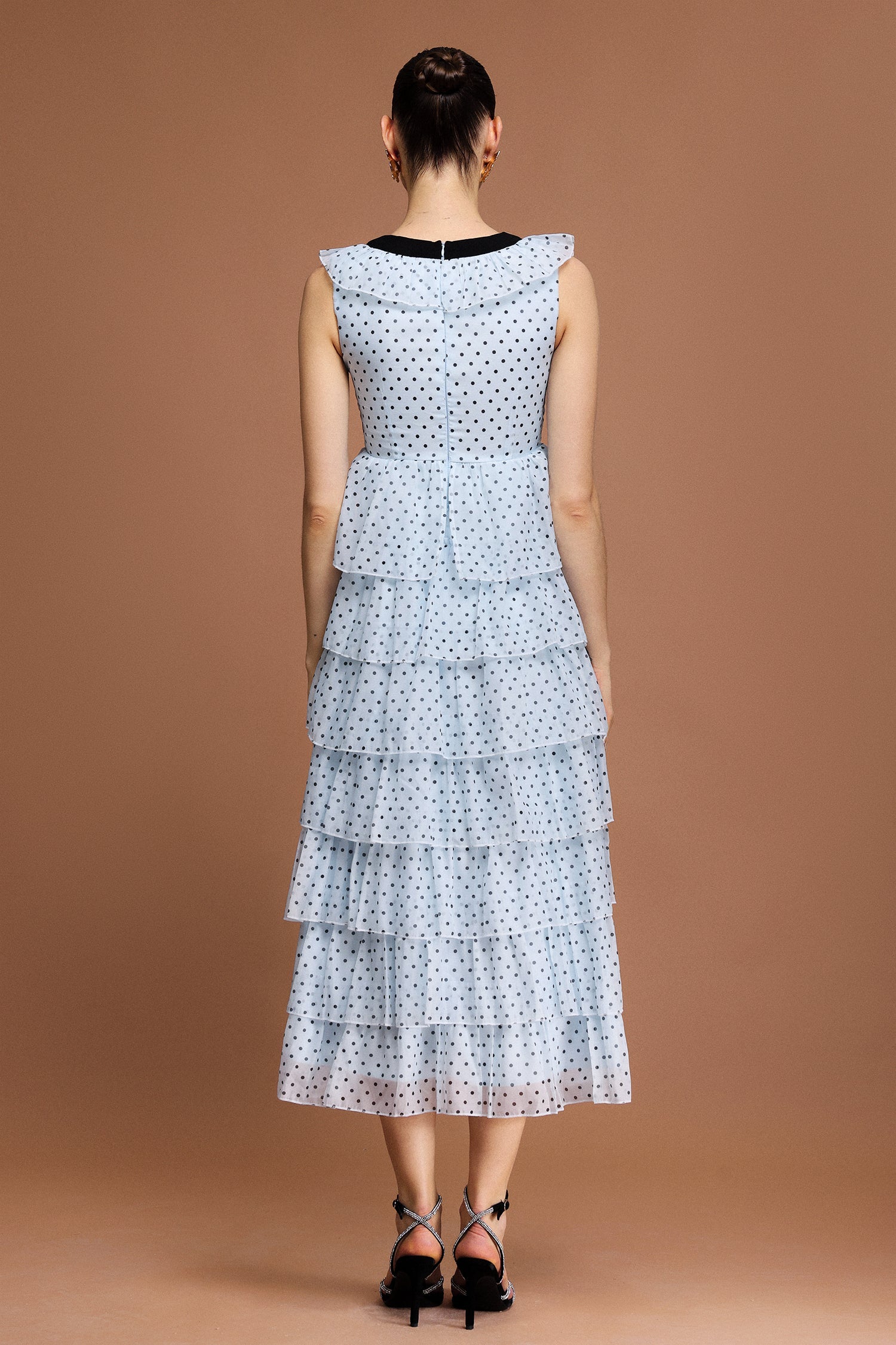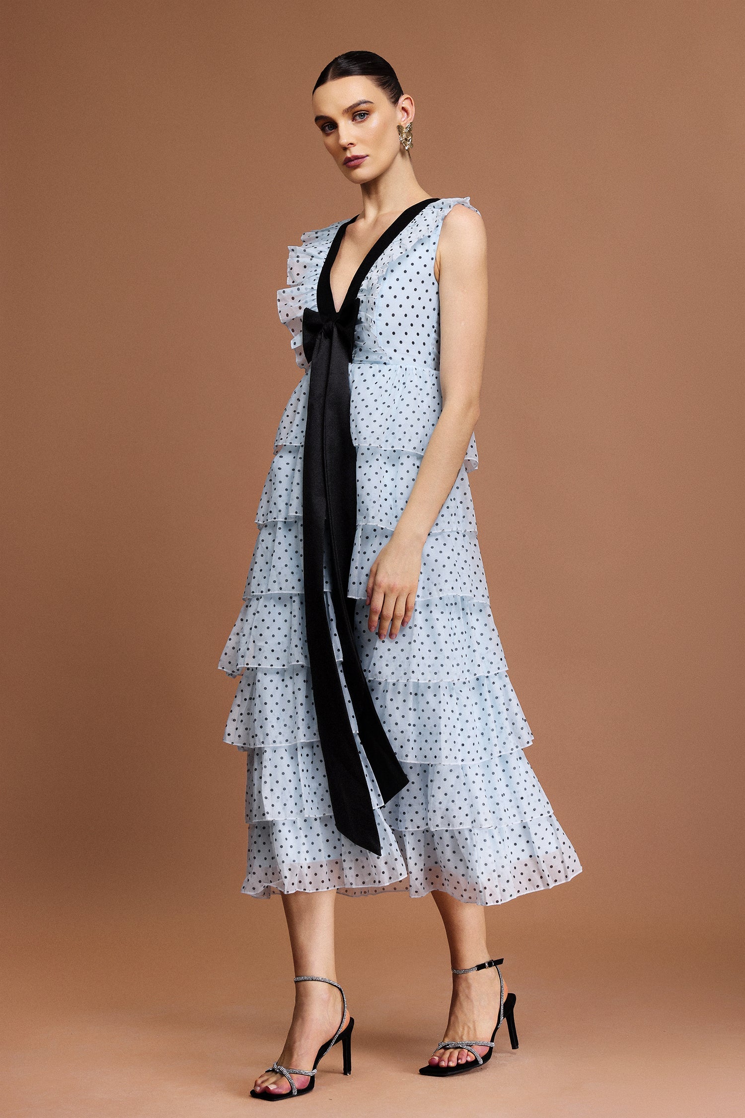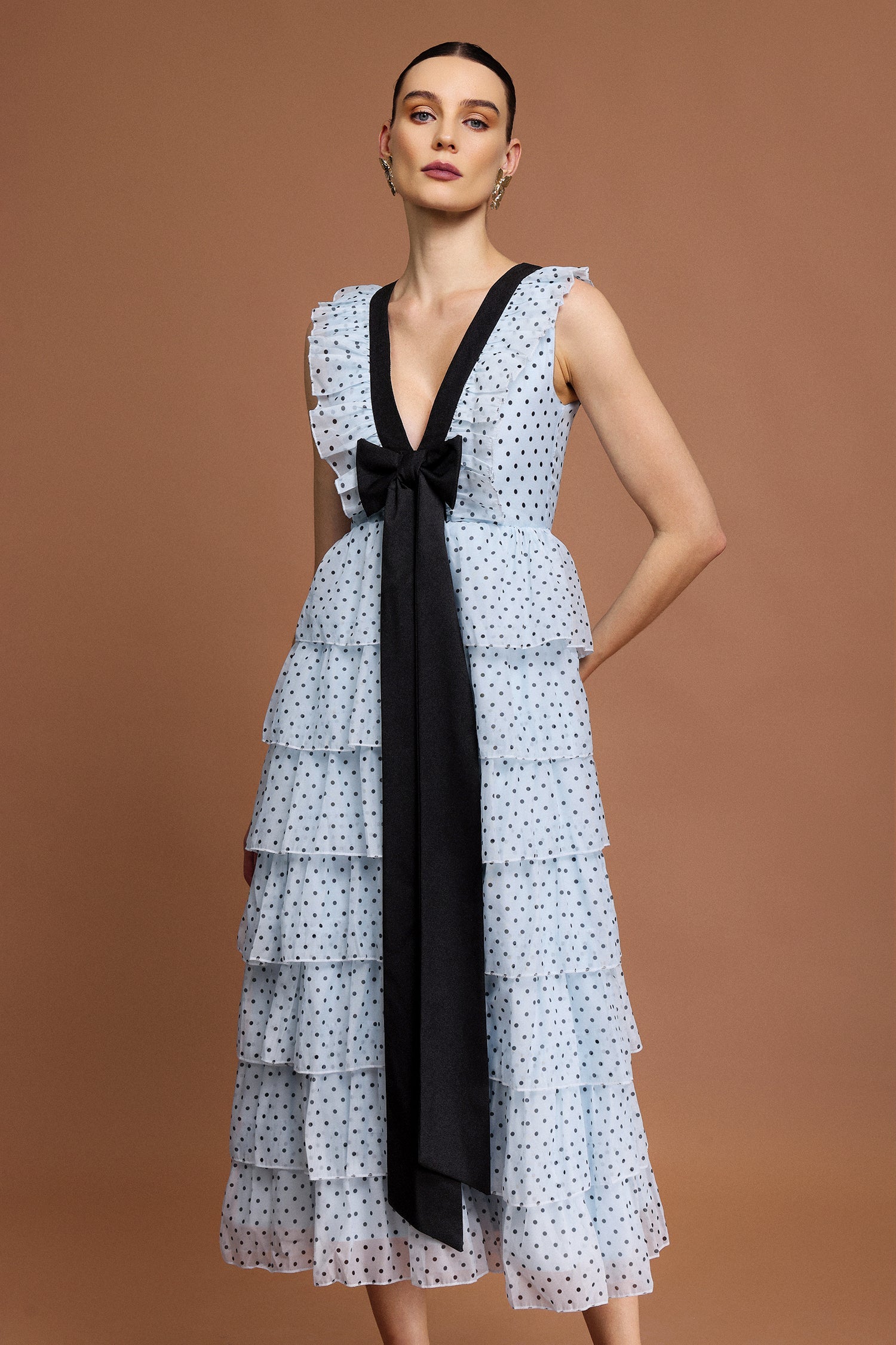 V-Neck Sleeveless Bowknot Folds Dot Printed Midi Dress - S is backordered and will ship as soon as it is back in stock.