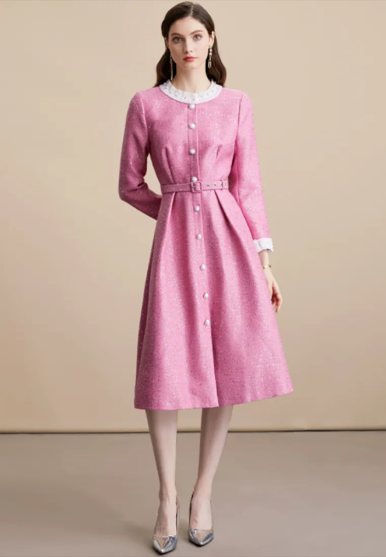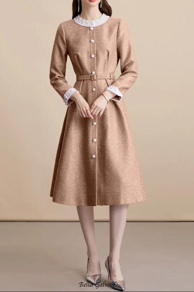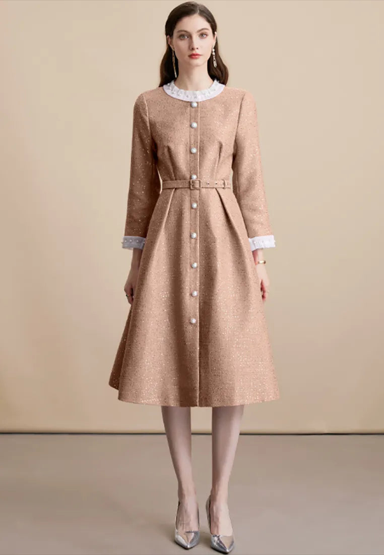Elevate your wardrobe with this sophisticated Virginia Tweed Sequin Khaki Midi Dress, where timeless tailoring meets contemporary glamour. Crafted from premium tweed fabric, this piece features delicate sequin embellishments that catch the light beautifully, adding subtle sparkle to your ensemble. The midi length offers versatile styling options—dress it up for evening events or down for refined daytime wear. The khaki tone provides a neutral, flattering base that pairs effortlessly with your existing accessories. Perfect for those who appreciate quality construction and understated elegance.