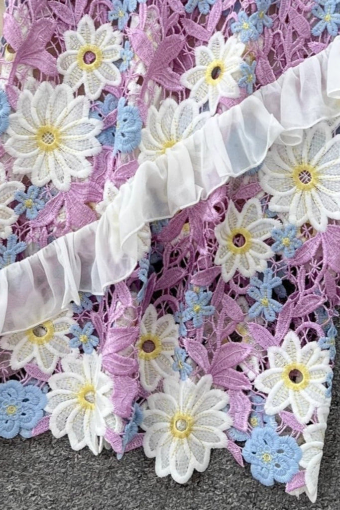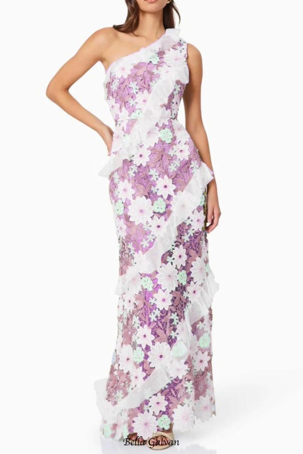 Elevate your occasion wear with this Floral One Shoulder Lace Maxi Dress in purple. Expertly crafted with delicate lace, it offers a graceful silhouette amplified by the asymmetric one-shoulder design. The flowing maxi length enhances movement and adds sophistication, making it ideal for formal events or elegant evenings. The rich purple hue complements a variety of skin tones, ensuring a striking and memorable presence.