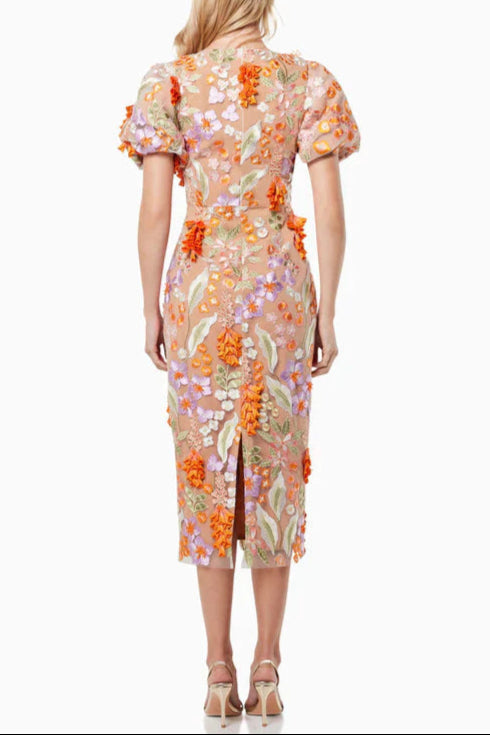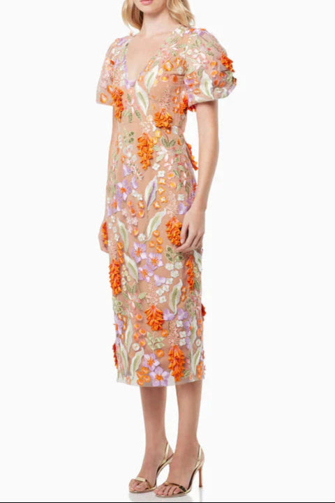 Mesh embroidered 3D flower V-neck puff sleeves midi dress in orange
