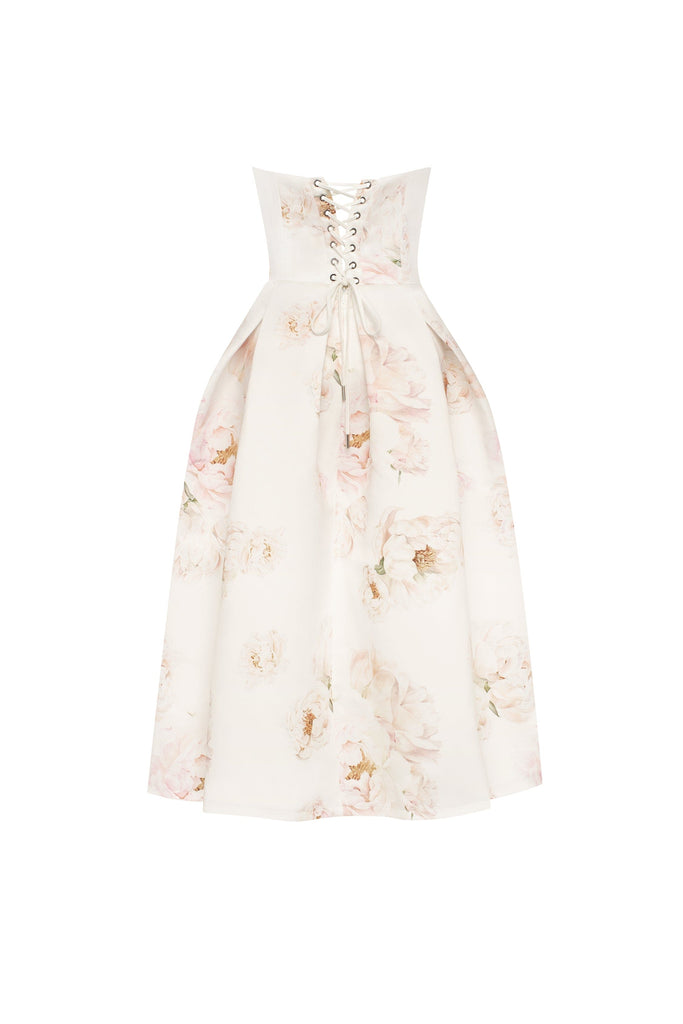 This adorable midi dress is an absolute go-to choice for any special occasion. Cut from satin ivory fabric with printed pink peonies, this dress has a figure-hugging bodice with a straight neckline, a lace-up closure, and a flared midi skirt. The waist is highlighted by Milla's signature golden belt.