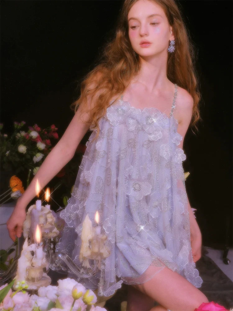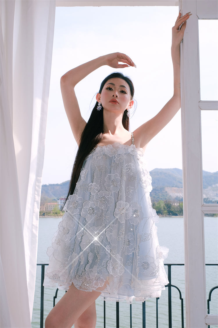 Tutu Light Blue Sleeveless Flower Diamond Short Doll Dress