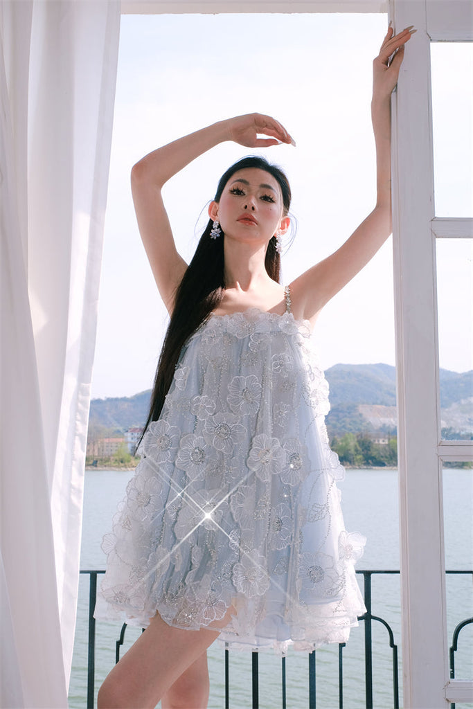 This exquisite dress from our “Tutu” is the epitome of chic and lovely. With its light blue color, sleeveless design, and charming flower diamond details, this dress is perfect for any occasion. Feel like a precious gem in this luxurious tutu dress.