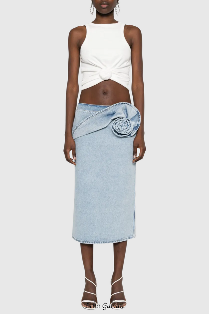 Indulge in luxury with our Laundra floral appliqué denim midi skirt. Crafted with intricate floral detailing, this skirt adds a touch of elegance and femininity to your wardrobe. Made with high-quality denim, it offers both style and comfort. Perfect for a sophisticated and exclusive look.