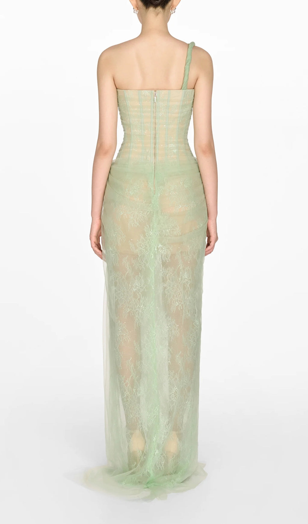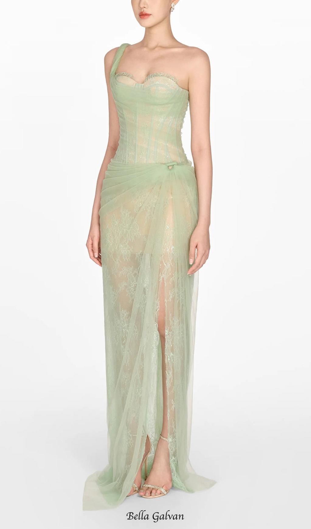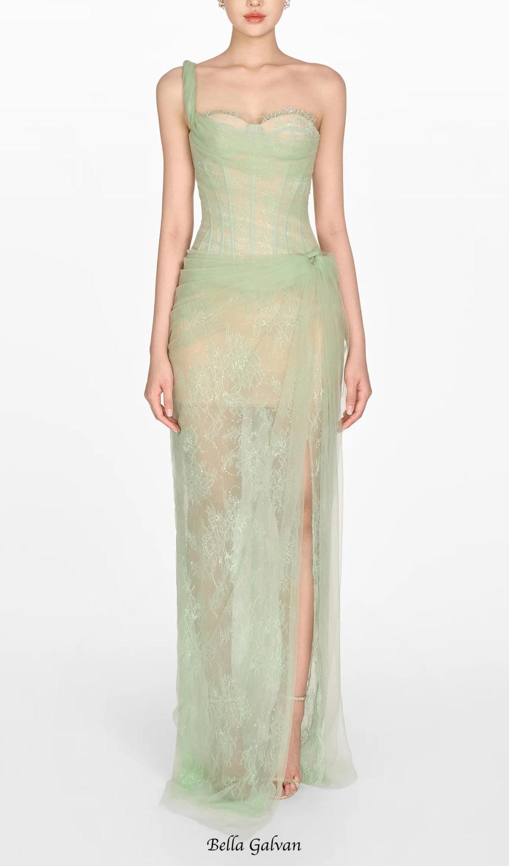 ONE SHOULDER MESH RUCHED MIDI DRESS IN GREEN
