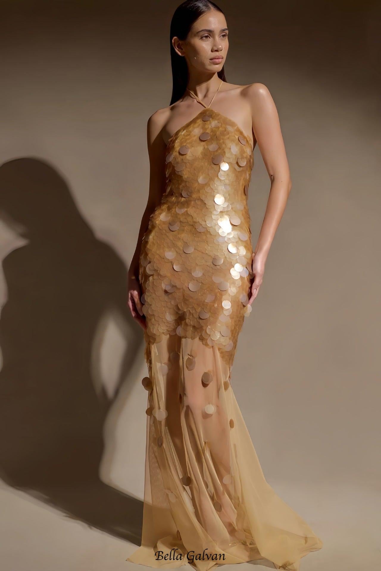 Elevate your evening wardrobe with this stunning sequin-embellished maxi dress in radiant gold. The intricate beadwork catches light beautifully, creating a mesmerizing shimmer with every movement. The daring backless silhouette offers modern sophistication, while the flowing maxi length provides elegant coverage and graceful draping. Perfect for galas, formal events, or upscale celebrations where you want to make a memorable impression. This piece combines glamorous detailing with refined tailoring for a show-stopping look.