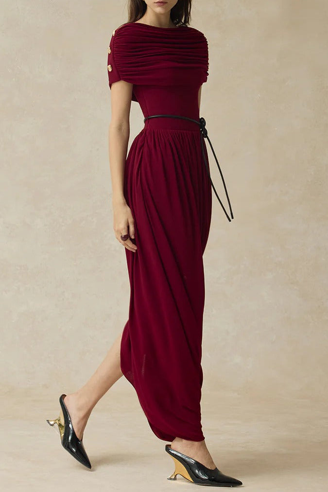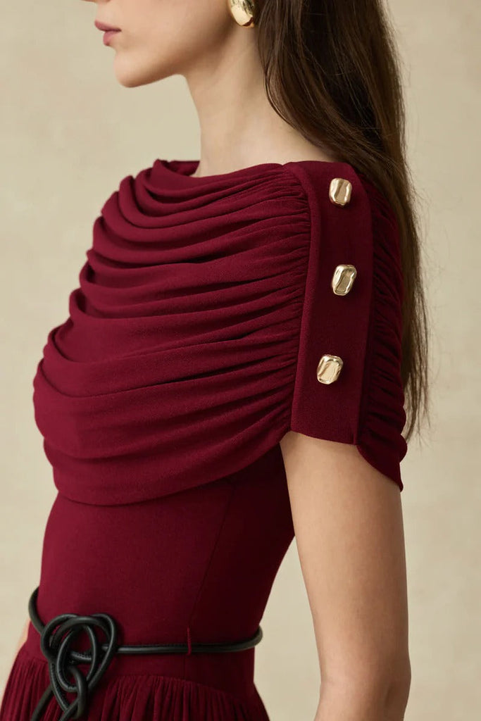 The Cecilia Cocoon Gathering Maxi Dress in wine offers a sophisticated silhouette featuring gentle gathers that enhance comfort and elegance. Crafted for a flattering fit, this maxi dress drapes beautifully, making it ideal for both formal occasions and refined everyday wear. Its rich wine color adds depth and versatility, effortlessly elevating your wardrobe with a timeless touch.