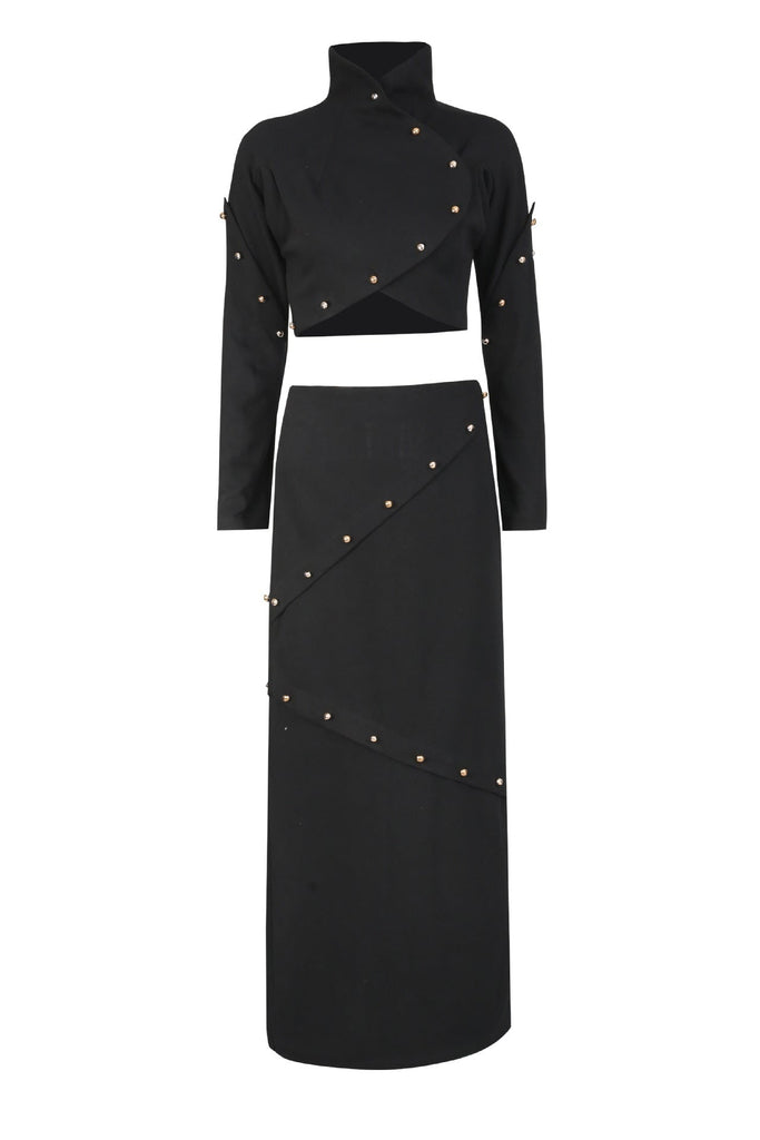 Button-embellished cotton-jersey top maxi skirt suit in black