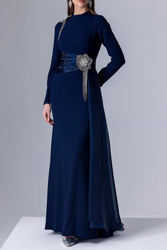 crystal flower Long-sleeve lace pleated maxi dress in blue