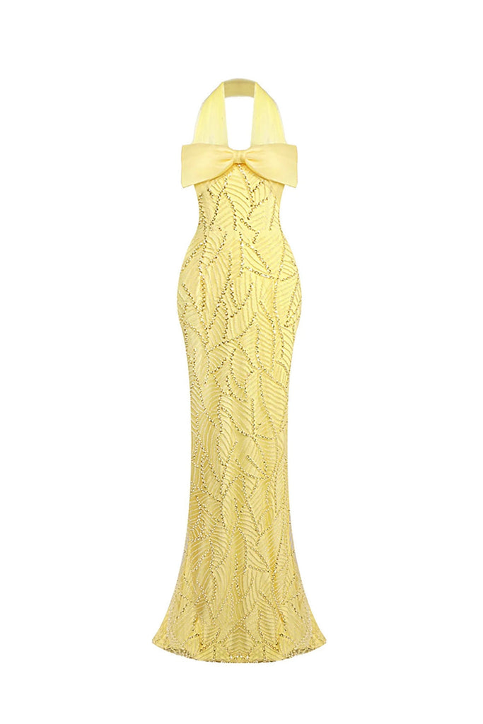 irene Halterneck Bowknot Beaded bodycon maxi dress in yellow