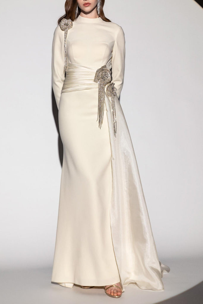 crystal flower Long-sleeve lace pleated maxi dress in apricot