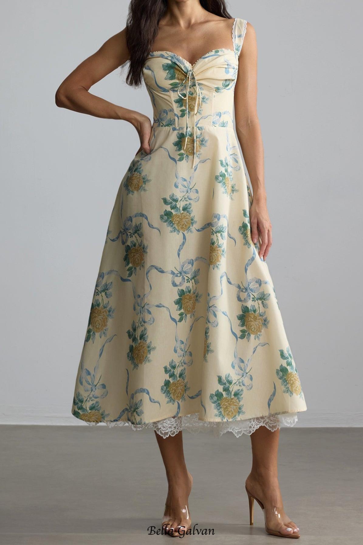 daphne Floral Print Sweetheart Midi Dress in yellow