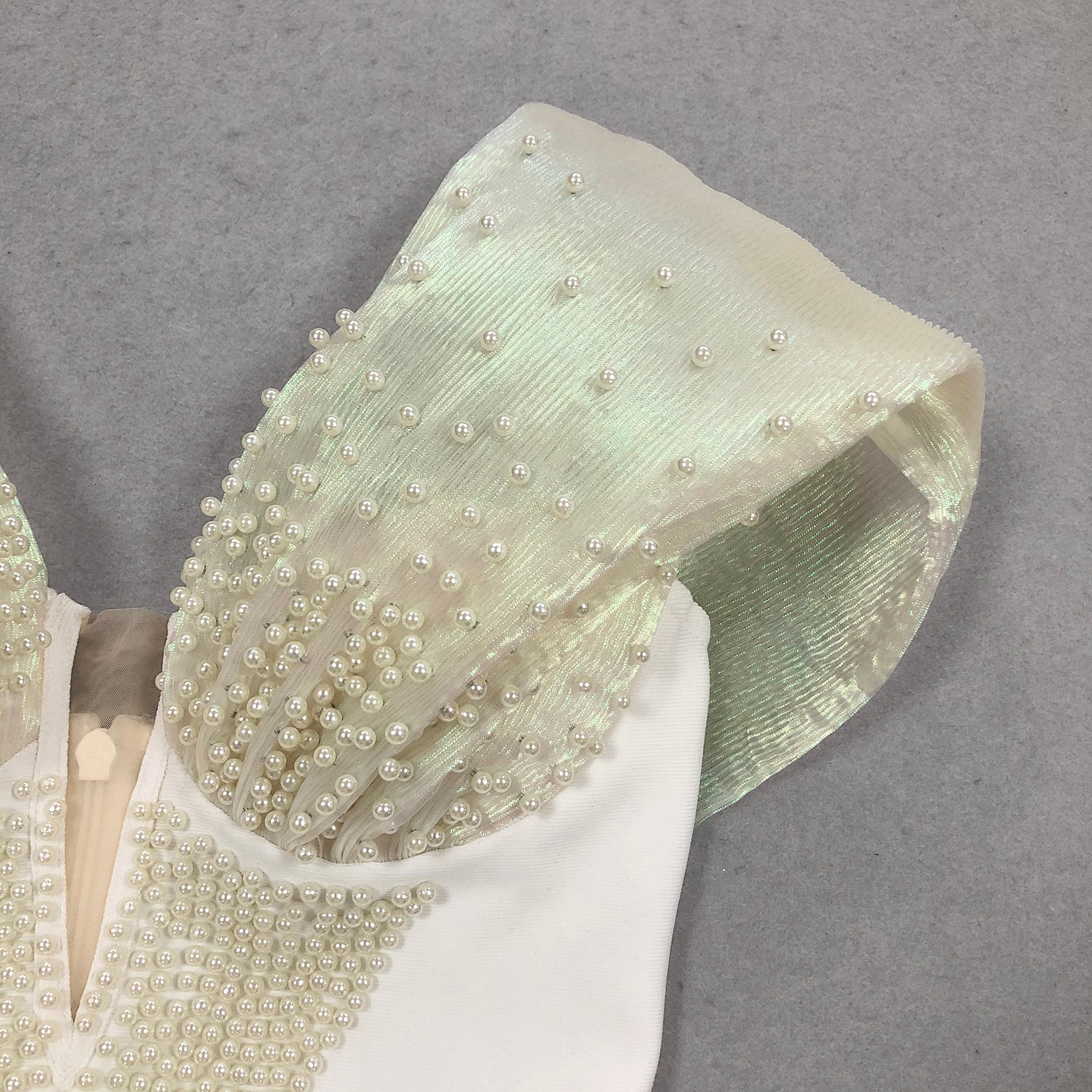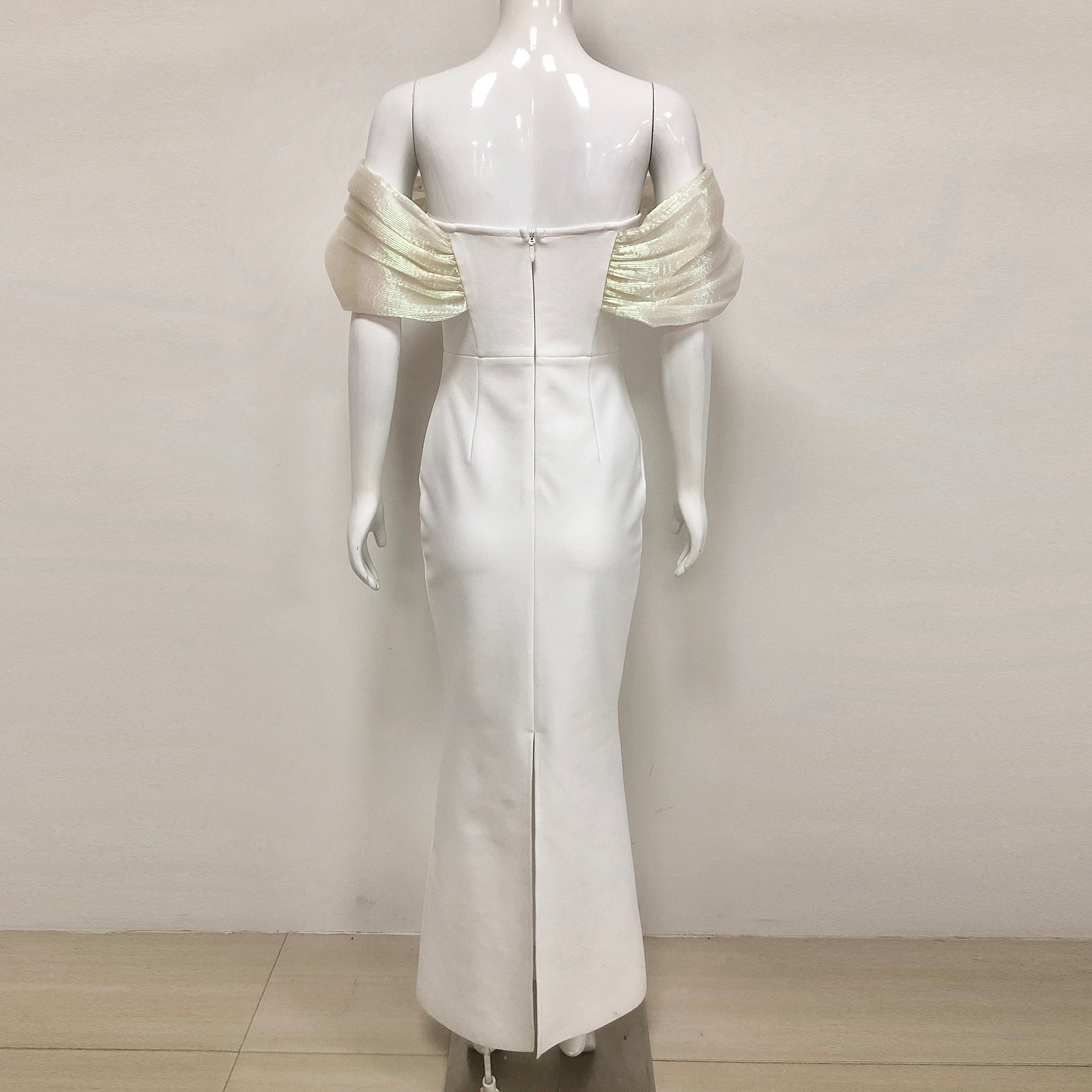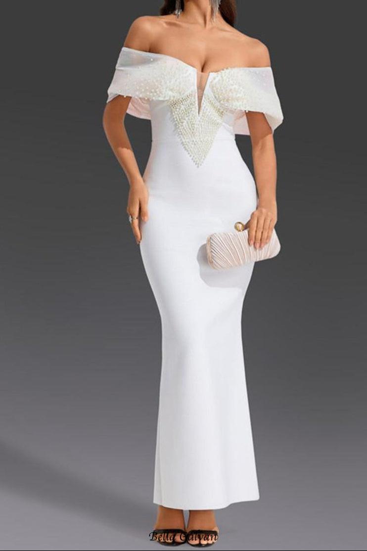 This sophisticated off-shoulder bodycon maxi dress combines timeless elegance with contemporary design. Adorned with delicate pearl embellishments throughout, the pristine white fabric creates a stunning contrast that catches the light with every movement. The figure-hugging silhouette enhances your natural curves while the maxi length offers a graceful, elongating effect perfect for formal occasions and evening events.