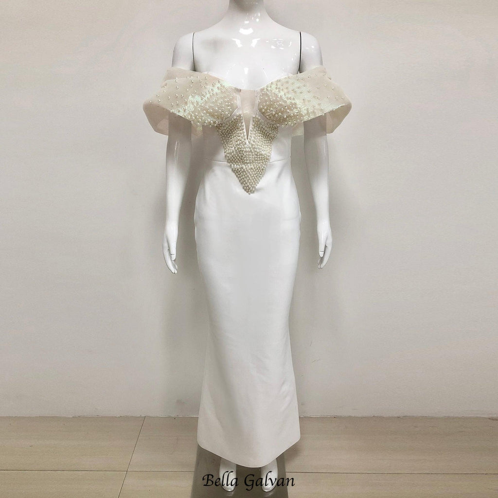 Off-Shoulder pearl embellished bodycon maxi dress in white