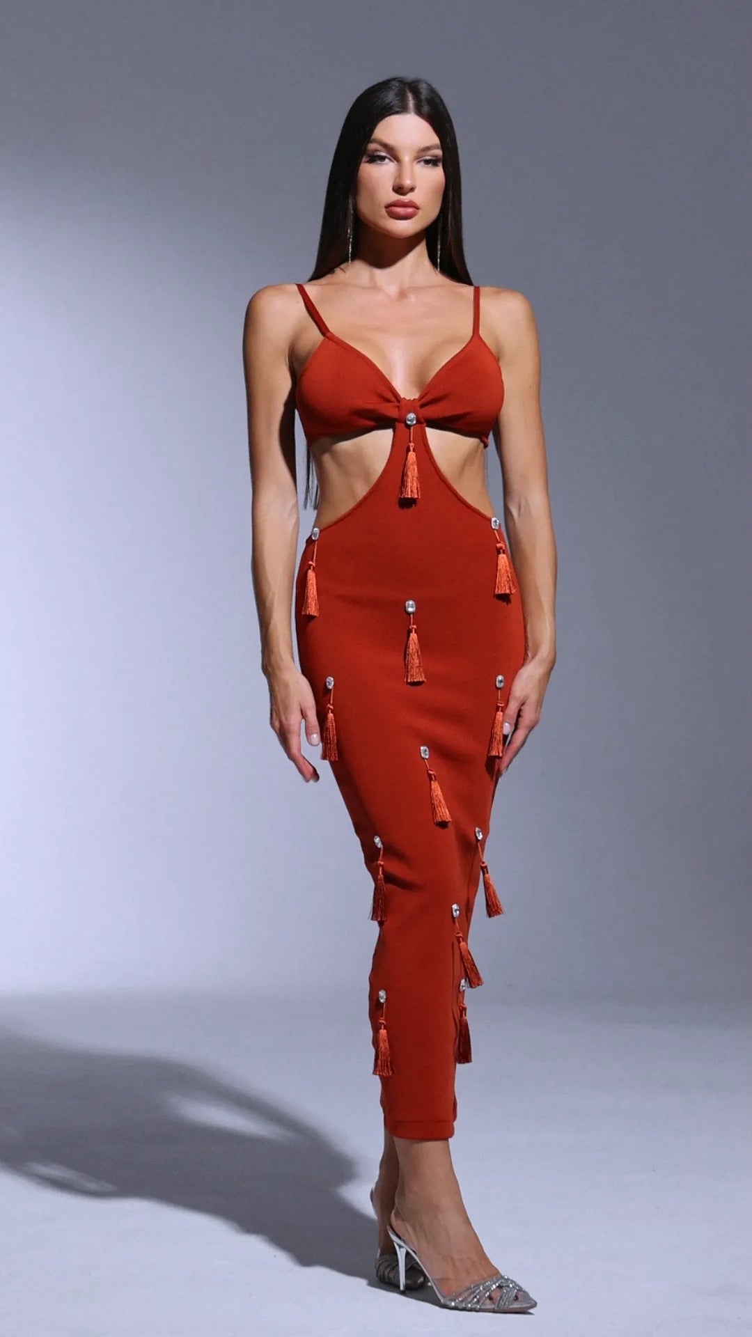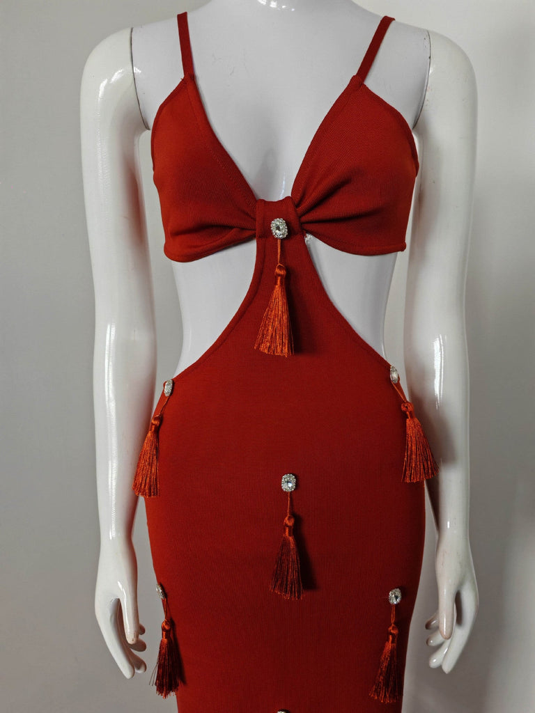 Deep-V Diamond Tassels Bandage Maxi Dress in red