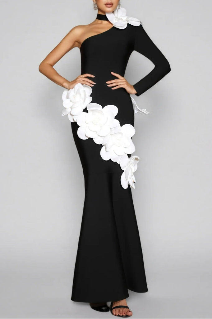 gemma One Shoulder 3D Flower Bandage Maxi Dress in black
