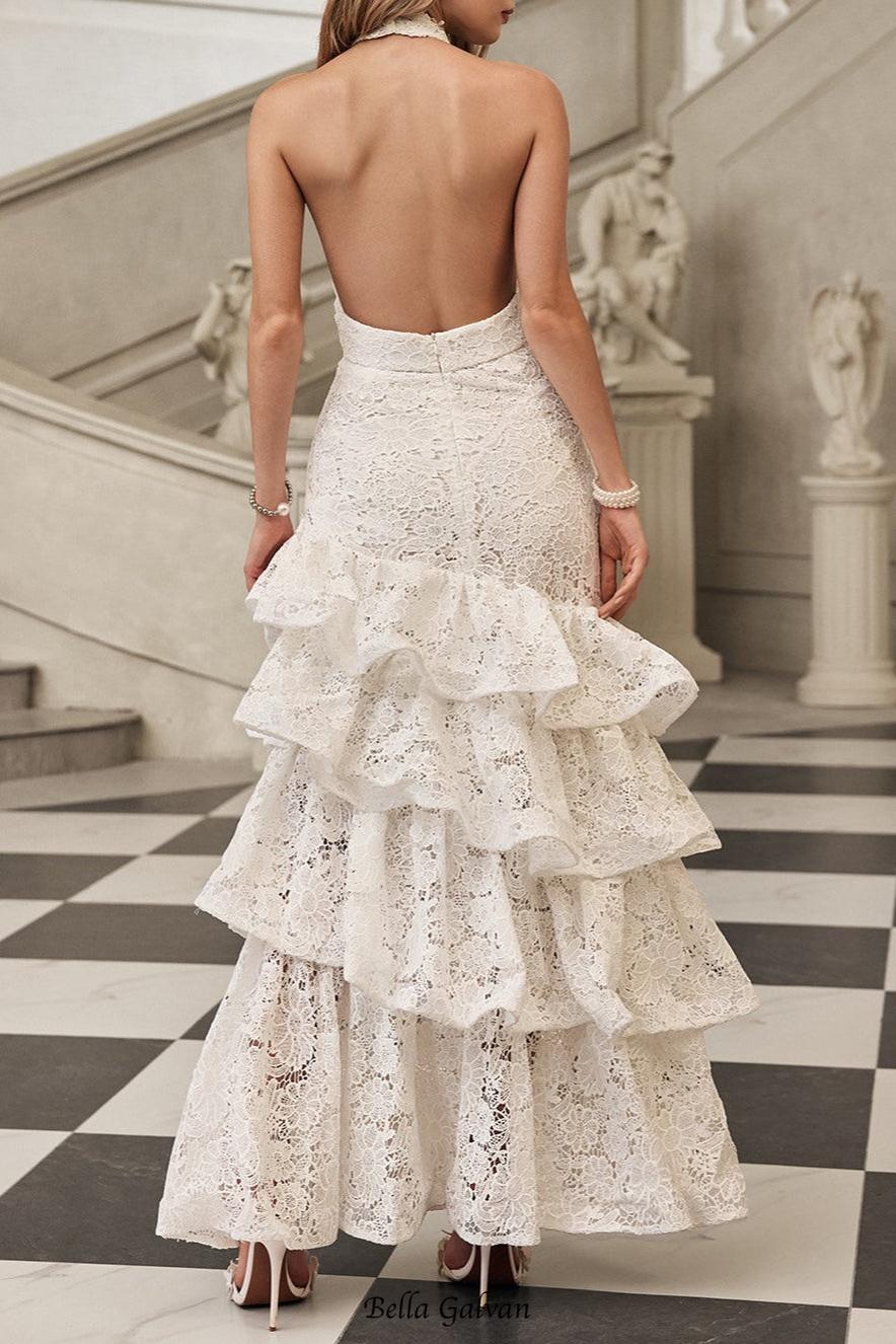 hazel white Deep V-neck halterneck layer ruffle trim maxi dress