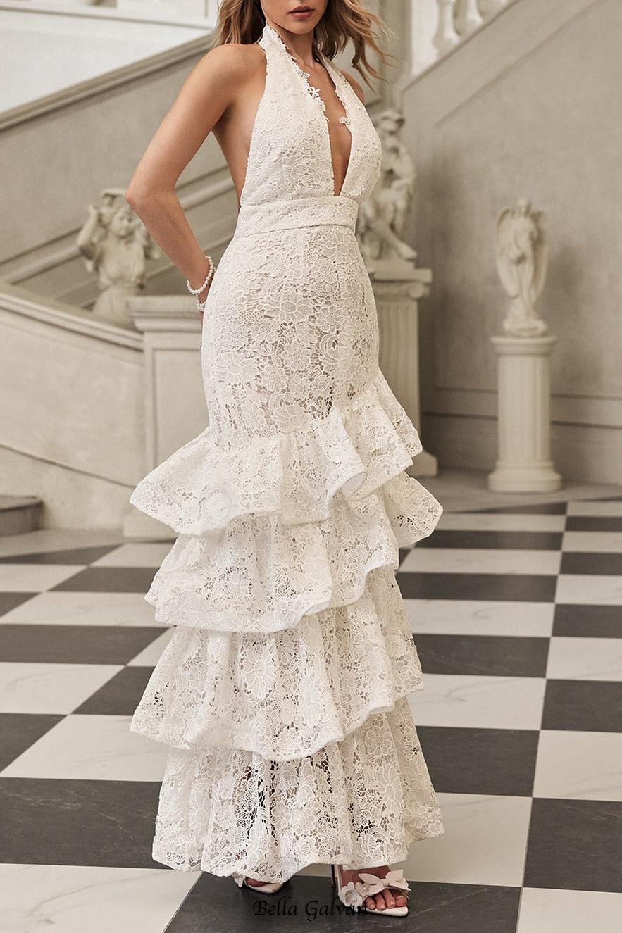 hazel white Deep V-neck halterneck layer ruffle trim maxi dress