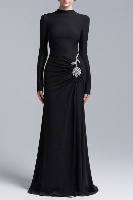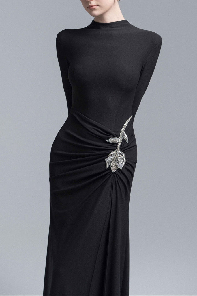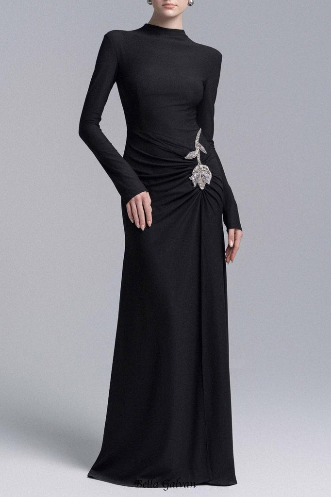 This black Hedwig Rose gown features delicate embellishments that add refined elegance to its gathered sheath silhouette. Designed to flatter the figure, the gown combines sophisticated craftsmanship with subtle detailing, making it an ideal choice for formal occasions where understated luxury is essential. Its sleek fit and tasteful adornments ensure a timeless and polished appearance.