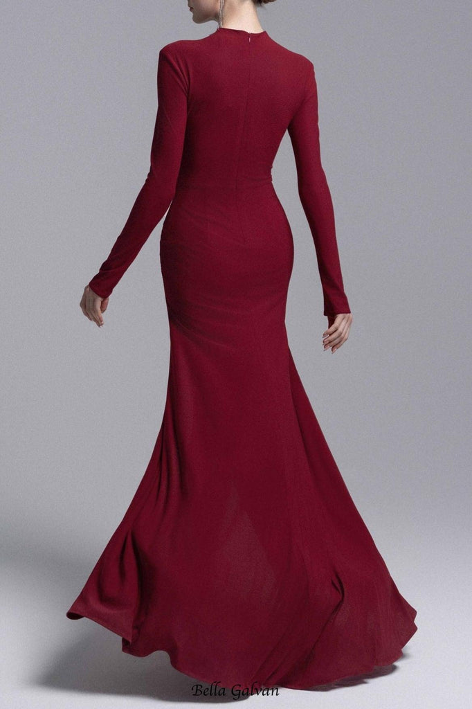 This Hedwig rose embellished gathered sheath gown in red offers a sophisticated silhouette with a flattering gathered detail that accentuates the waist. Intricately embellished with rose-inspired accents, this gown combines elegant craftsmanship with striking design, making it ideal for formal occasions where refined style is paramount. The rich red hue enhances its dramatic appeal, ensuring a standout presence at any event.