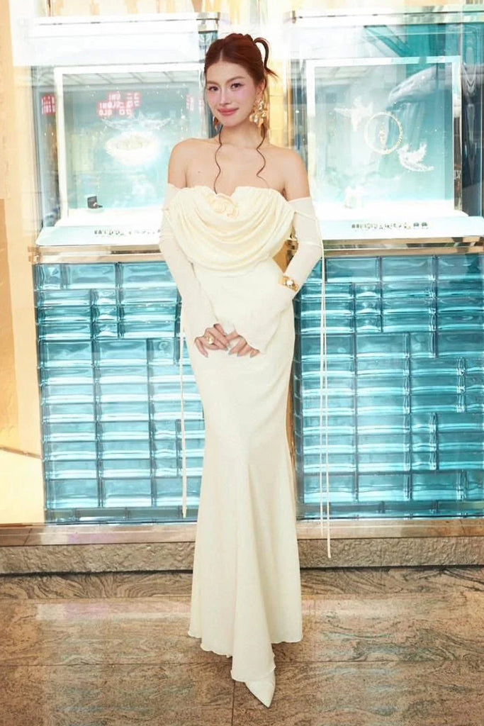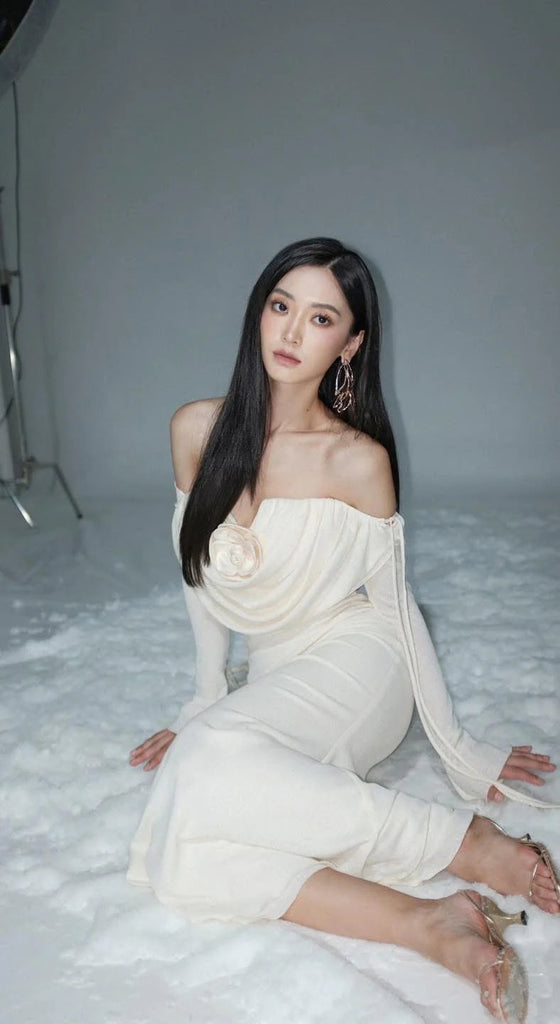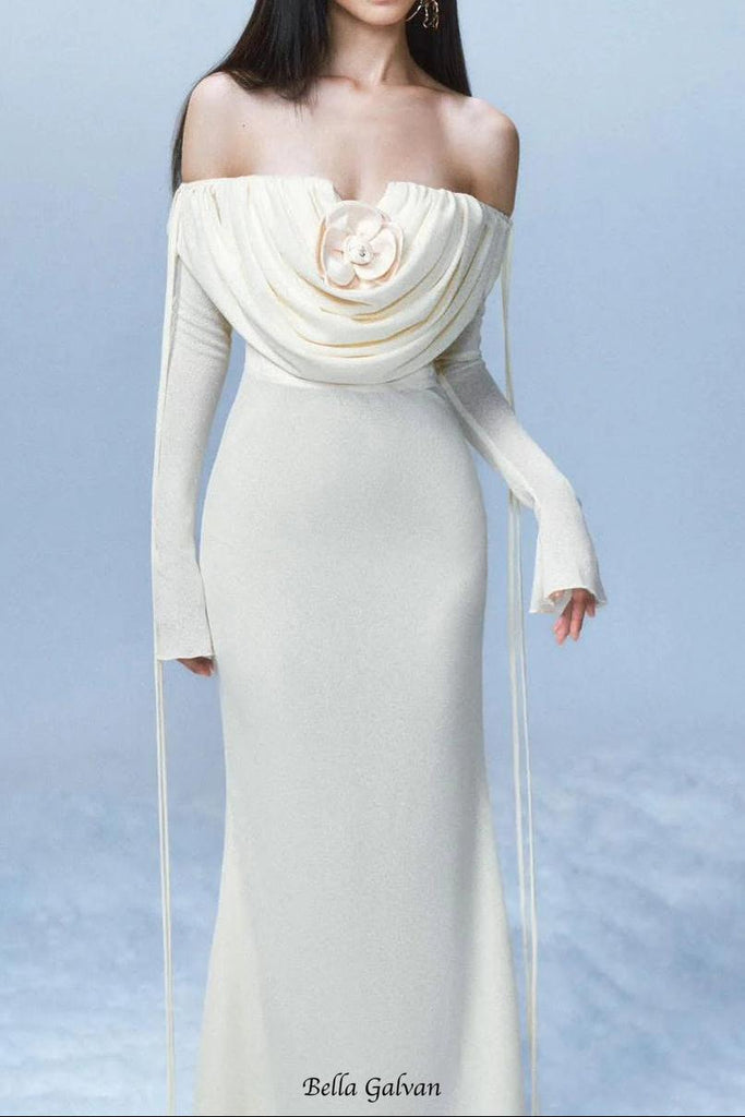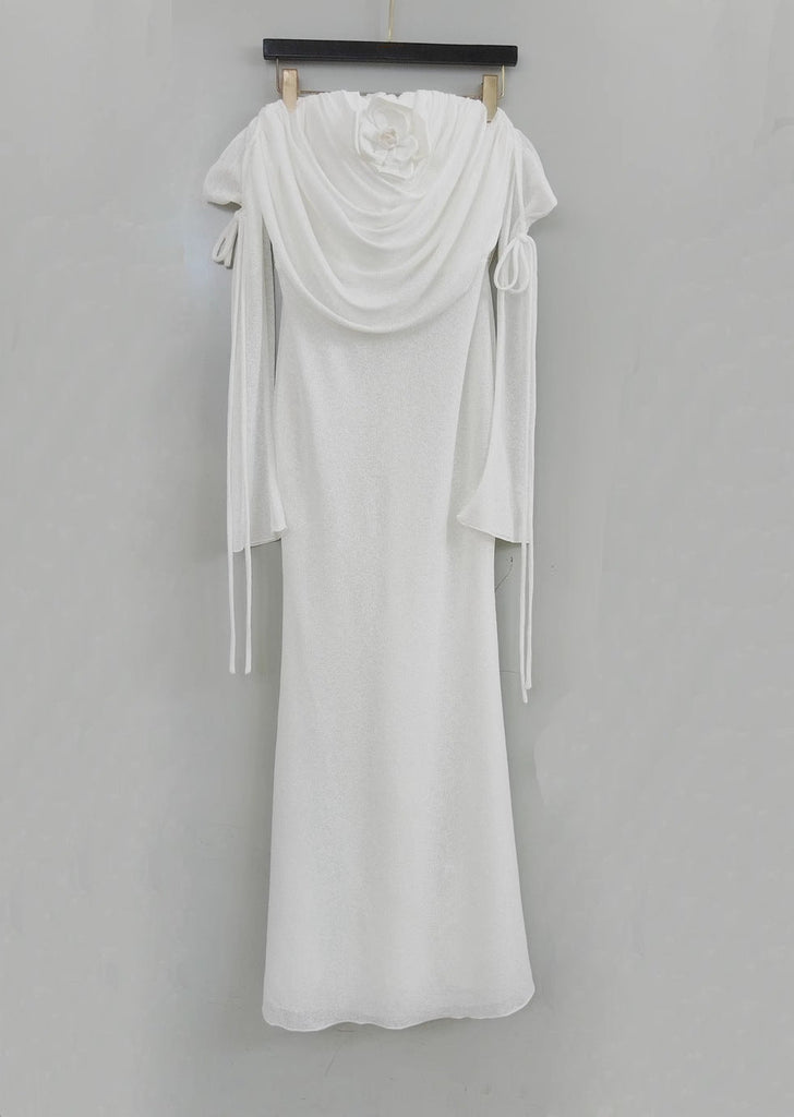 Elevate your formal wardrobe with this sophisticated strapless maxi dress, featuring delicate lila flower embellishments that add refined elegance. The pleated bodice creates a flattering silhouette while the flowing white fabric drapes gracefully to the floor. Perfect for weddings, galas, or upscale evening events, this piece combines timeless design with intricate detailing. The strapless neckline offers a polished, versatile look that pairs beautifully with statement jewelry or classic accessories.