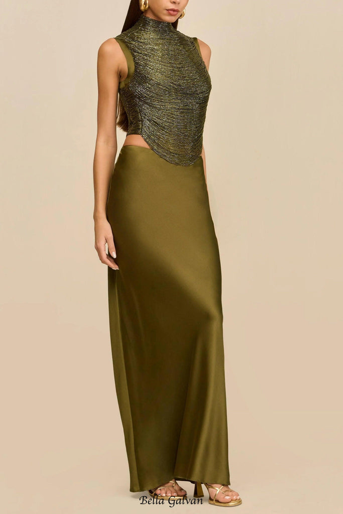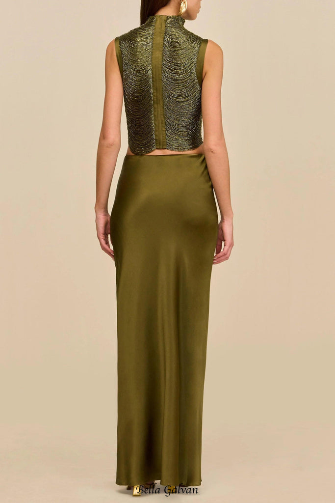 Sleeveless Turtleneck Tassel Paneled Top and Satin Skirt Set in green