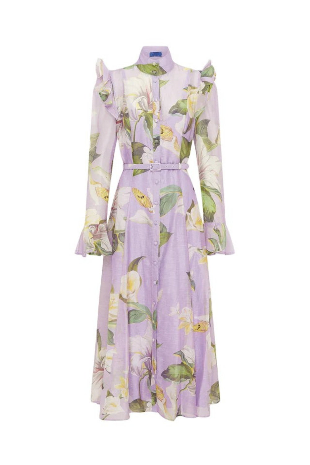 Elevate your wardrobe with this enchanting midi dress, featuring a delicate lily blossom print set against a soothing lilac backdrop. The signature butterfly sleeves add an ethereal dimension, creating graceful movement with every step. Crafted for refined elegance, this piece transitions seamlessly from daytime gatherings to evening occasions. The midi length offers sophisticated coverage while maintaining a contemporary silhouette. Perfect for those who appreciate botanical-inspired design paired with thoughtful tailoring, this dress embodies timeless femininity with modern sensibility.