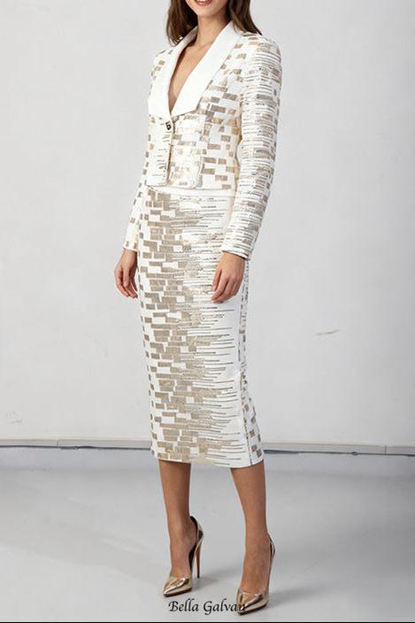Elevate your formal wardrobe with this sophisticated blazer suit featuring a striking gold sequin print on crisp white. The tailored blazer delivers polished structure and refined elegance, while the coordinating high-waisted skirt creates a flattering silhouette that elongates the leg. The luxurious sequin detailing catches light beautifully, making this set ideal for evening events, cocktail parties, or upscale occasions. Crafted for the discerning dresser who values both impact and quality, this two-piece ensemble transitions seamlessly from statement-making event wear to versatile layering pieces in your collection.