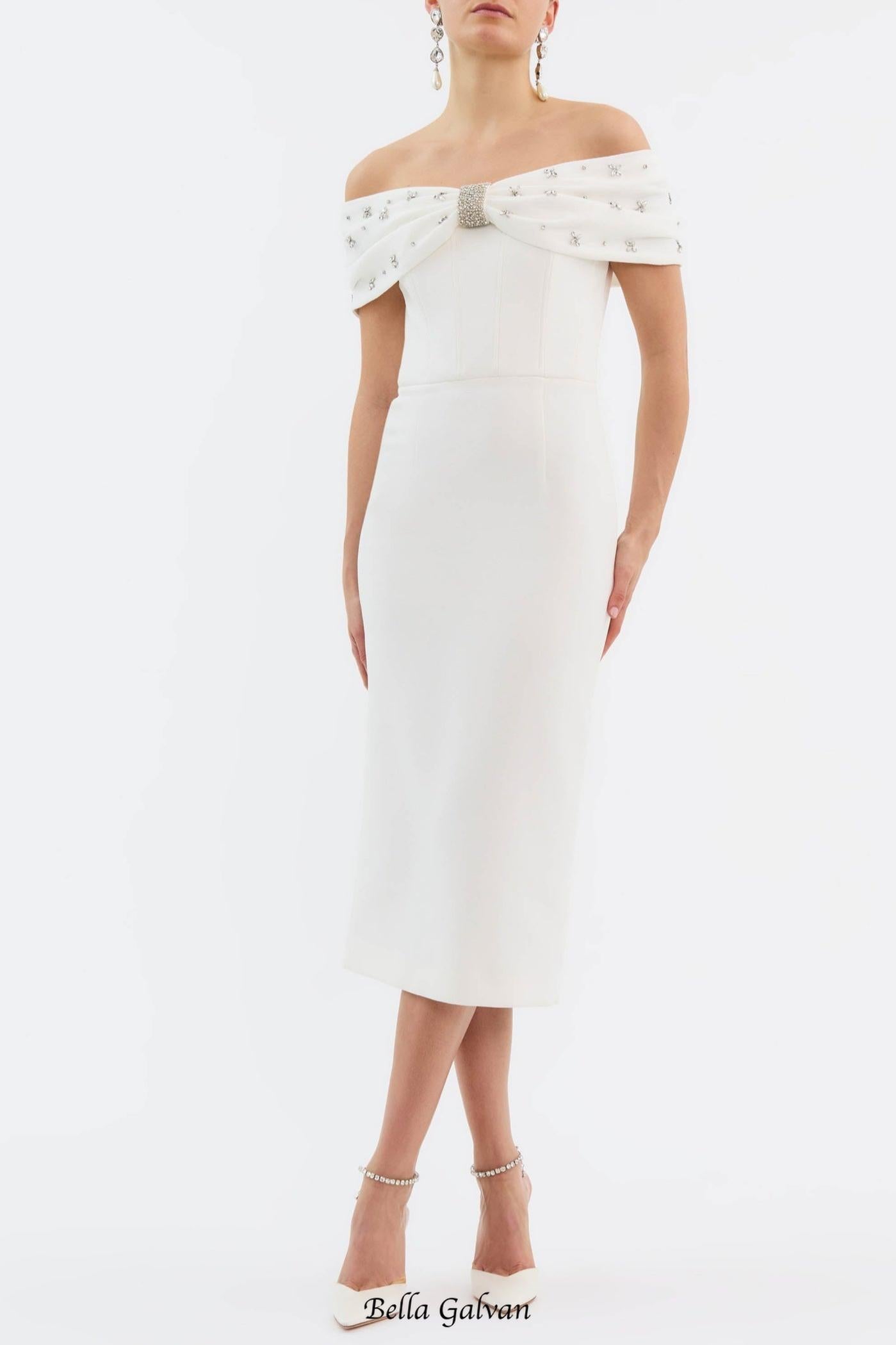 Off Shoulder Crystal Embellished Midi Dress