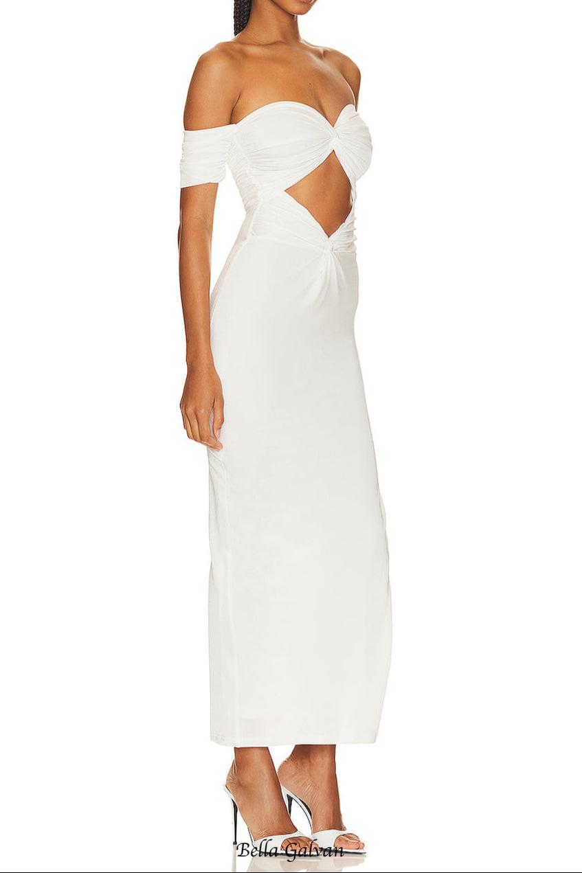 This elegant white midi dress features a pleated design that adds texture and movement, while the off-shoulder neckline highlights the collarbones for a sophisticated look. The subtle cutout detail enhances its modern appeal, making it perfect for formal events or stylish daytime occasions. Crafted to flatter the silhouette, this dress combines classic charm with contemporary style.