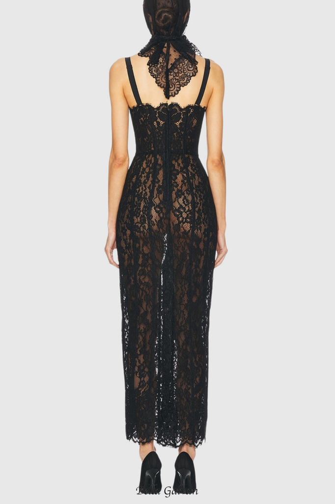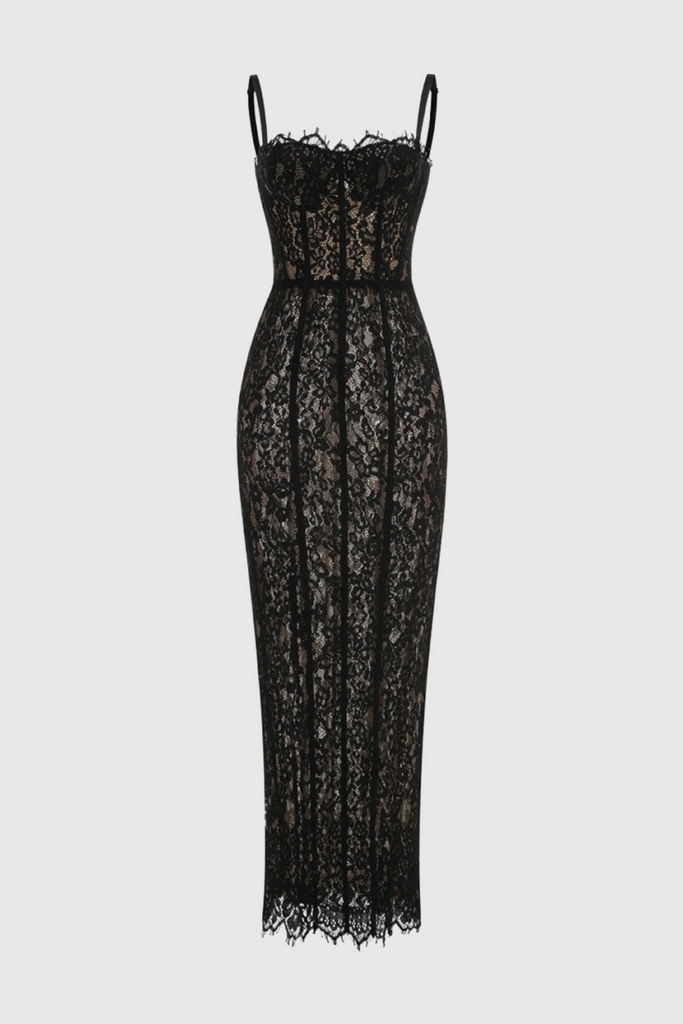 Elevate your evening attire with the Freda Lace Corset Maxi Dress in black. This sophisticated design features a structured corset bodice adorned with delicate lace detailing, transitioning into a flowing maxi-length skirt. The timeless black colorway ensures versatility for formal events, while the corset construction provides flattering support and definition to your silhouette.
