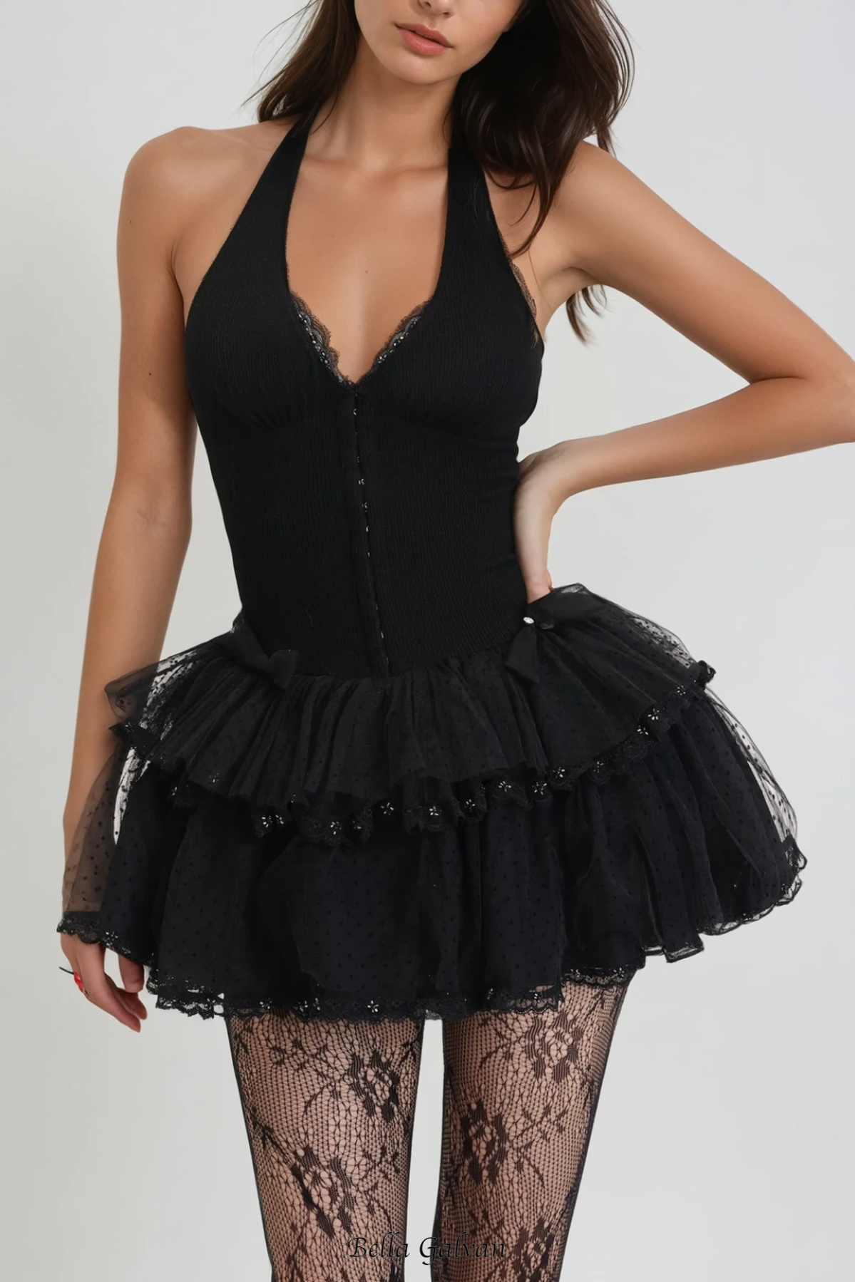 The Gina Mesh Halter Neck Corset Mini Dress combines sophisticated structure with alluring transparency. Featuring a supportive halter neckline and corset-inspired bodice, this black mini dress creates a flattering silhouette while the mesh fabric adds a contemporary edge. Perfect for evening events where making a confident statement is essential.
