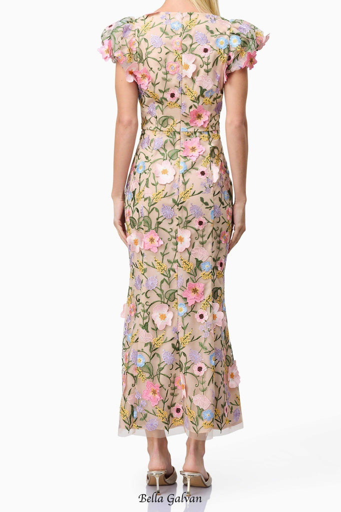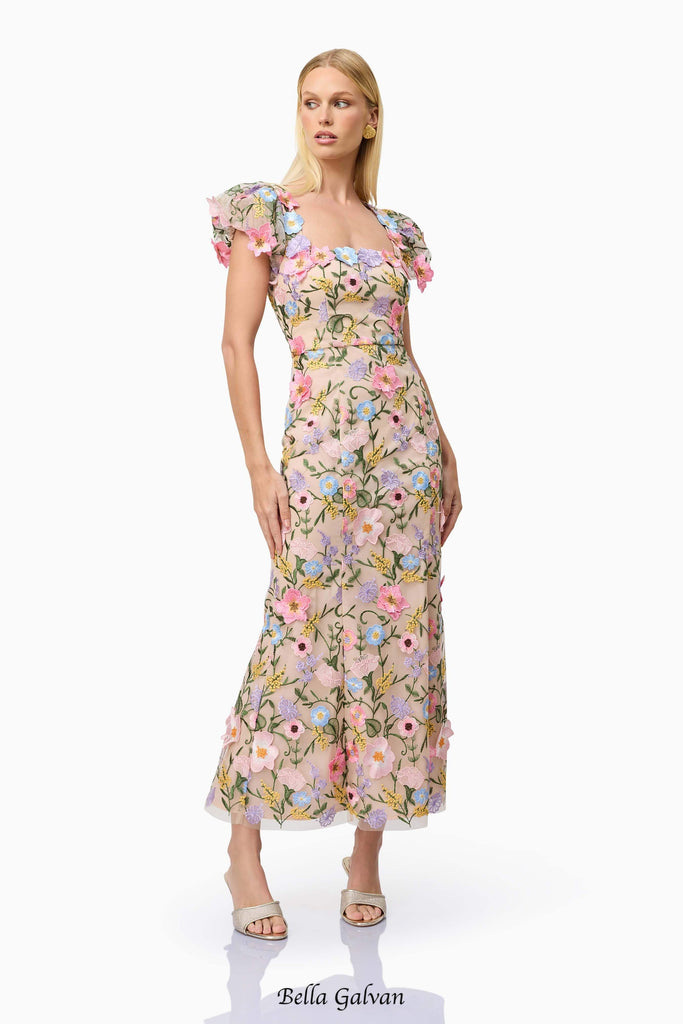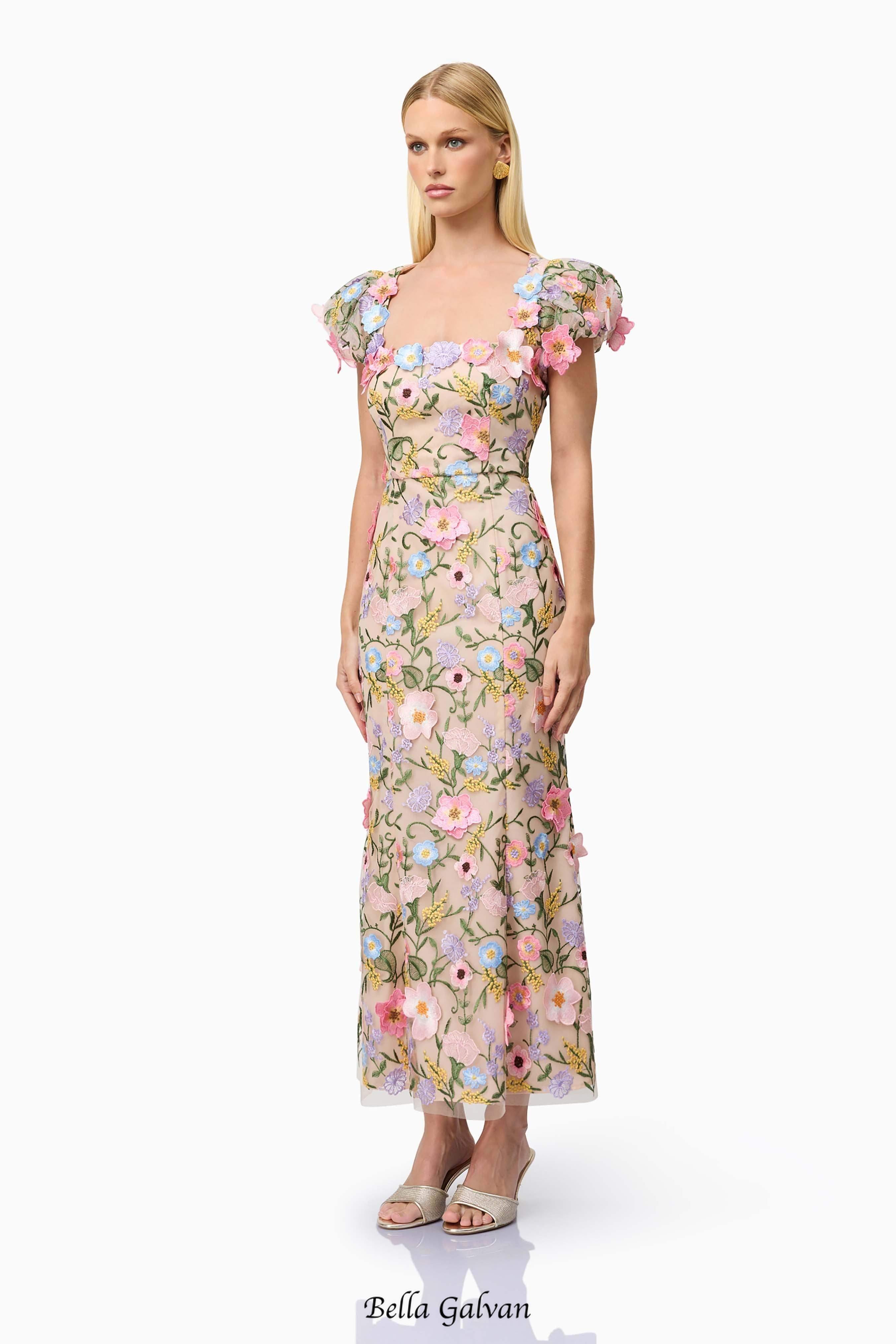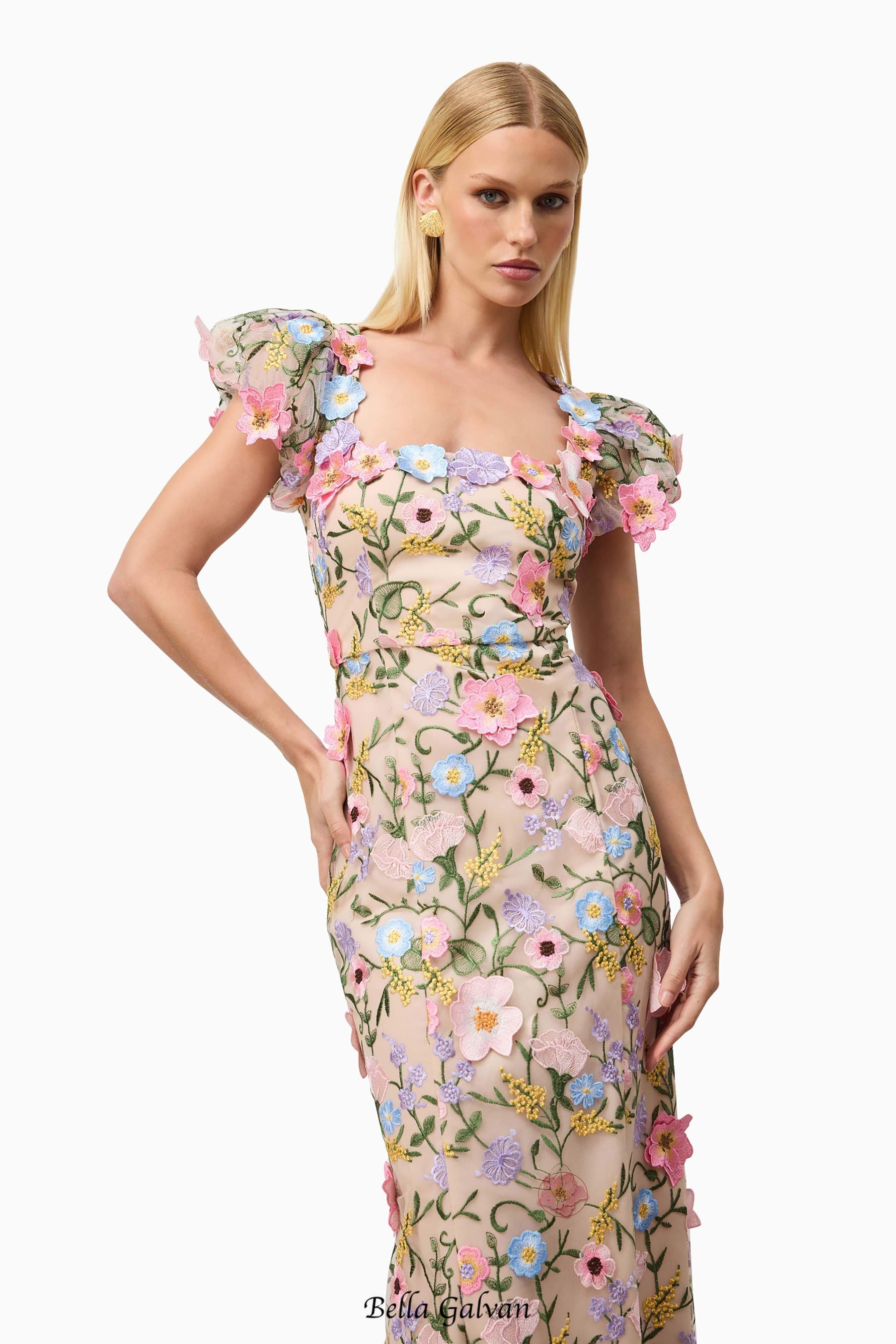 Nydia multicolor Square collar with 3D flower embroidery maxi dress