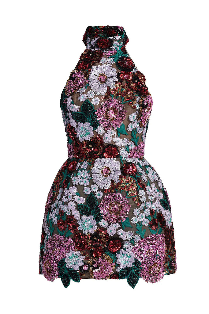Violet open-back embroidered mini dress