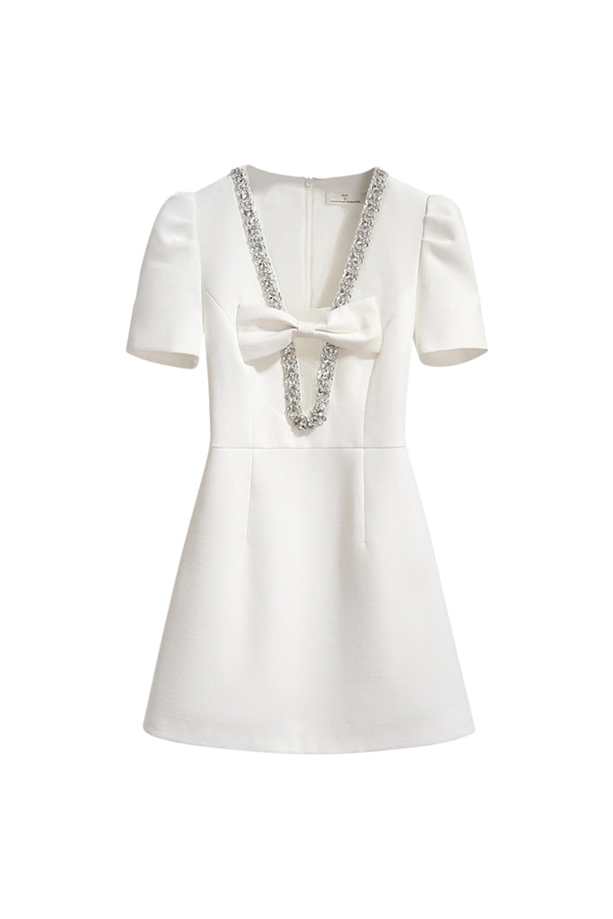 V-neck diamond chain bow mini dress in ivory