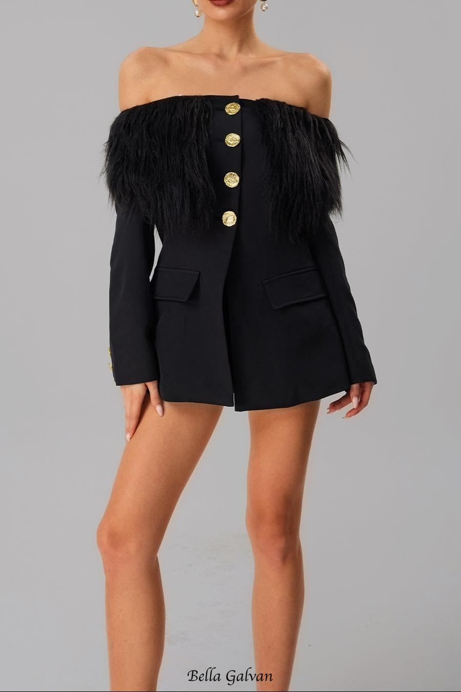 Make a bold statement with this striking black off-shoulder blazer mini dress. Featuring elegant feather detailing and eye-catching metal buckle accents, it effortlessly blends sophistication with modern edge. The off-shoulder neckline creates a flattering, contemporary silhouette perfect for nights out or special occasions. Crafted to turn heads, this versatile piece pairs beautifully with heels or boots for an unforgettable look that celebrates your confidence and style.